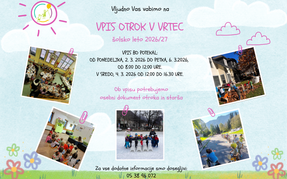 Vpis bo potekal od ponedeljka, 2. 3. 2026 do petka, 6. 3. 2026 v prostorih centralnega vrtca v Bovcu.