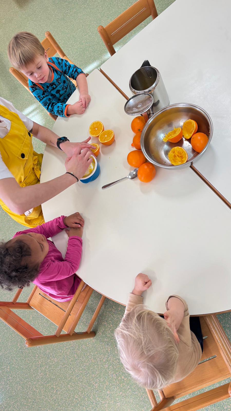 Pri Medvedkih smo se preizkusili v pripravi zdrave hrane. Stiskali smo pomarančni sok, pri čemer so otroci opazovali barvo, obliko, spoznavali vonj in okus naravnega soka. Skuhali smo tudi čaj, s čimer so otroci spoznavali postopke priprave pijače, razvijali fino motoriko in krepili samostojnost. Takšne aktivnosti spodbujajo razvoj fine motorike in pozitiven odnos do hrane.