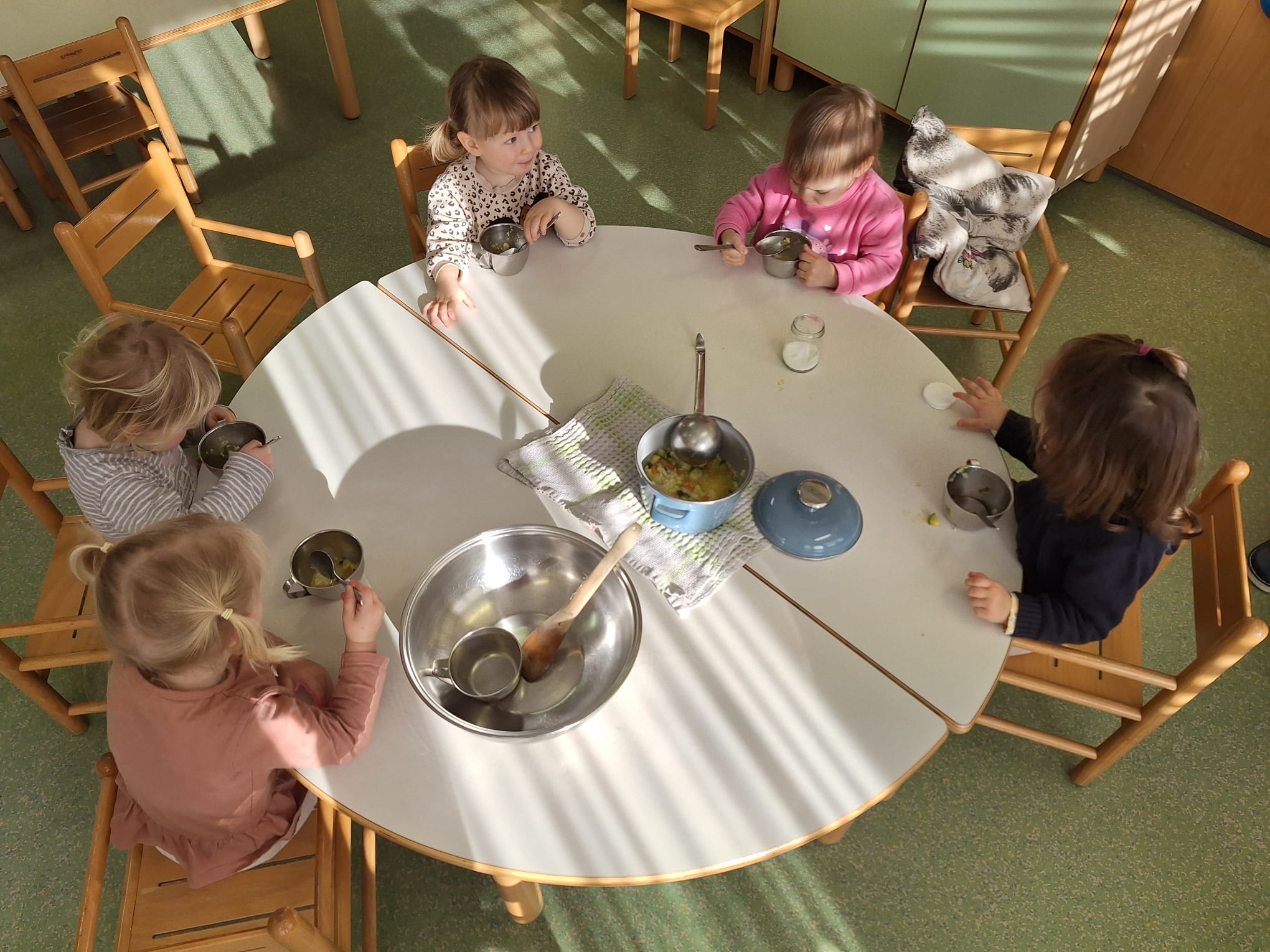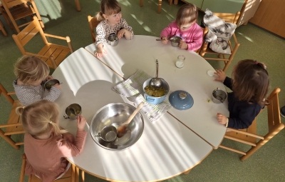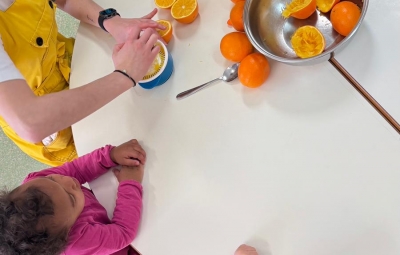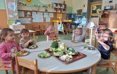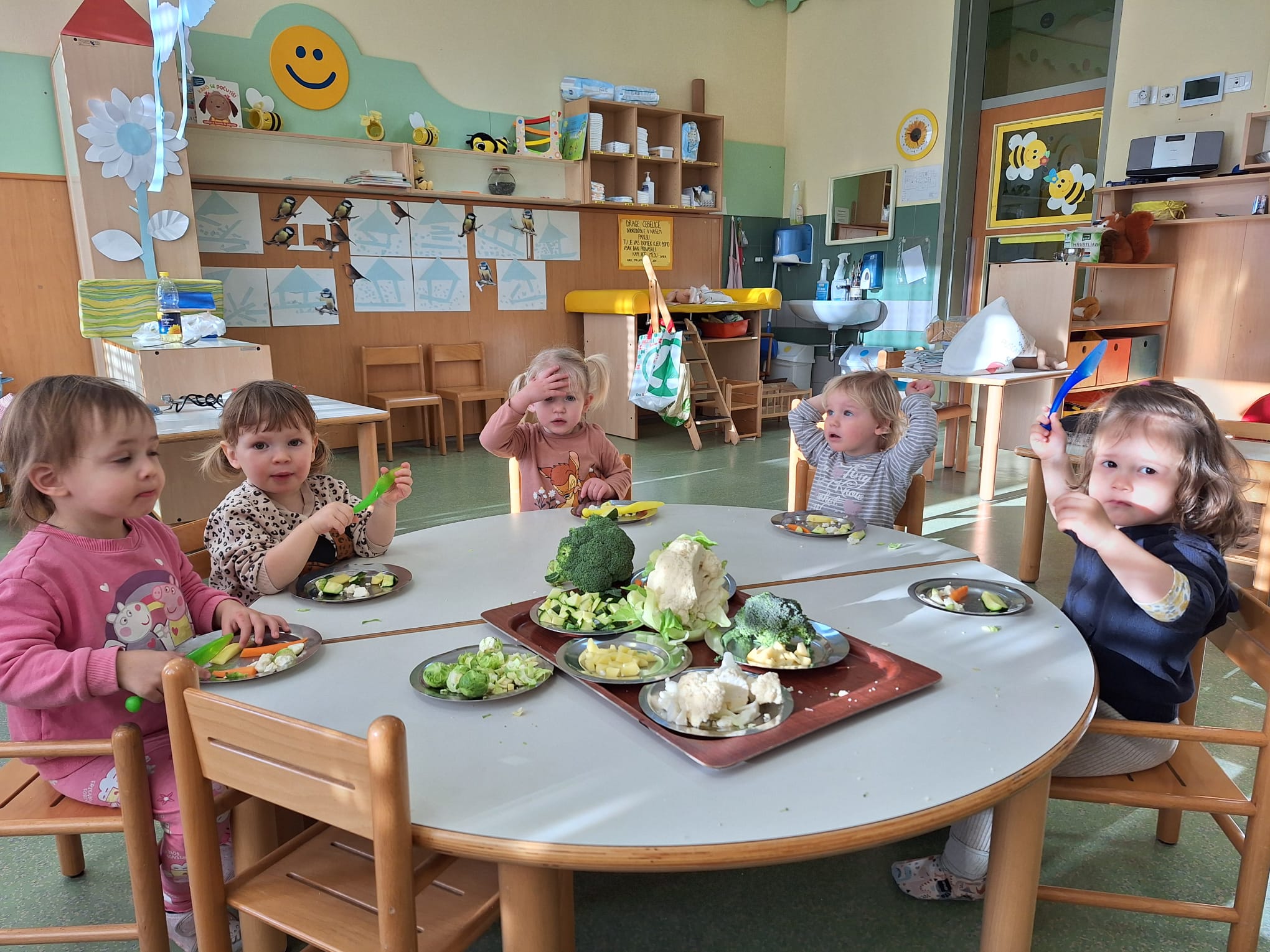 Pri Čebelicah smo se v mesecu januarju posvetili tematskemu sklopu Zdravje v vrtcu, katerega namen je bil pri otrocih razvijati zavedanje o pomenu zdrave prehrane ter oblikovanju zdravih življenjskih navad. Cilji so bili spoznavanje zdrave prehrane, pomen vitaminov, razvijanje pozitivnega odnosa do sadja in zelenjave ter spodbujanje samostojnosti pri pripravi hrane. Ena od dejavnosti je bilo stiskanje pomarančnega soka. Najprej smo z otroki opazovali pomaranče – njihovo barvo, obliko in strukturo lupine. Pogovarjali smo se, zakaj so zdrave, in poseben poudarek namenili besedi vitamini ter njihovemu pomenu. Otroci so ob naši pomoči pomaranče rezali, stiskali sok in ga tudi okušali. S tem so razvijali fino motoriko ter spoznavali okus in vonj, hkrati pa skozi konkretno izkušnjo ugotovili, da je naravni sok bolj okusen in zdrav. Skupaj smo pripravili tudi zelenjavno mineštro. Najprej smo spoznavali različne vrste zelenjave – otroci so jih tipali, vonjali in poimenovali. Sledilo je umivanje zelenjave, rezanje, opazovanje kuhanja in na koncu z veseljem poskusili svojo jed. Vsi smo jo z veseljem poskusili, čeprav so bili v mineštri koščki. Skozi tovrstne konkretne izkušnje otroci razvijajo pozitiven odnos do hrane. Takšne dejavnosti so temelj za oblikovanje zdravega življenjskega sloga, saj otroci znanje najbolje usvajajo, ko ga doživijo, preizkusijo in začutijo.