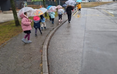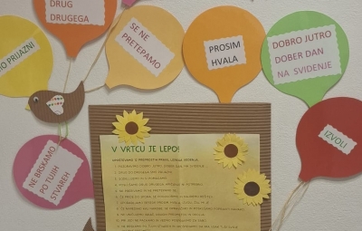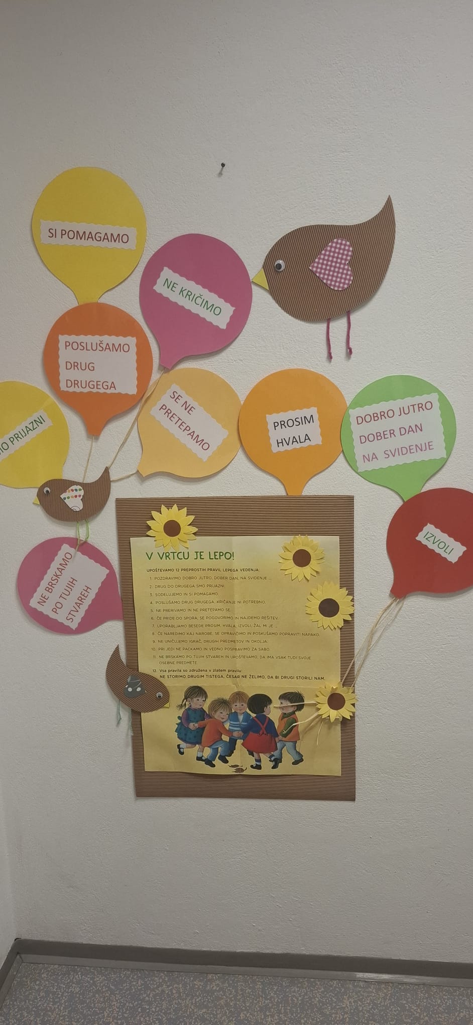 Pri Ptičkih smo posebno pozornost namenili lepemu vedenju, prijaznosti in medsebojnim odnosom. Ugotovili smo, da se vsi bolje počutimo, kadar smo drug do drugega spoštljivi in prijazni. Pogovarjali smo se o primernem vedenju ob obisku ter o tem, da s seboj vedno »vzamemo« bonton – besede, kot so prosim, hvala, izvoli, ja, prosim in ne, hvala. Naučili smo se tudi razlikovati med tikanjem in vikanjem. Dotaknili smo se tudi raznolikosti med ljudmi – spoznali smo, da imamo različne okuse, sposobnosti in da vsaka družina živi nekoliko drugače. Pogovarjali smo se o tem, kako pomembno je, da ne prizadenemo drugih z nepremišljenimi besedami, da se ne bahamo s tem, kar imamo, ter da svoje mnenje izrazimo na spoštljiv način. V ta namen smo izdelali »bontonski semafor« – kadar se vedemo primerno, pobarvamo zeleno luč, ob neprimernem vedenju pa rdečo. Spoznali smo tudi nekaj vaj za pomirjanje in obvladovanje neprijetnih čustev. Tudi v deževnem vremenu nismo pozabili na gibanje – obuli smo škornje, odprli dežnike in se odpravili na sprehod, kjer smo uživali v svežem zraku ter opazovali naravo v drugačni podobi.
