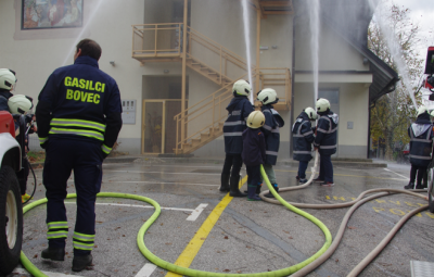Že na daleč smo slišali sirene, ko so prihajali in bili smo zelo navdušeni! Ko so parkirali na našem dvorišču, so nam mladi gasilci OŠ Bovec prikazali čisto pravo vajo gašenja.