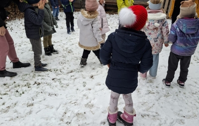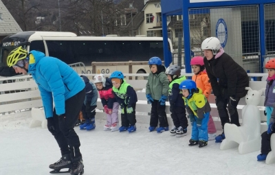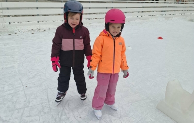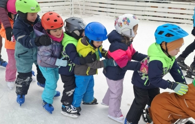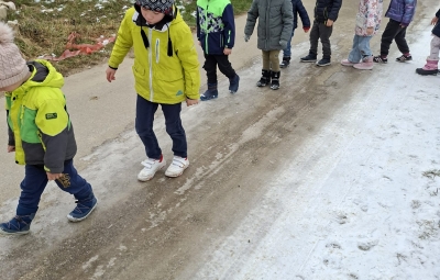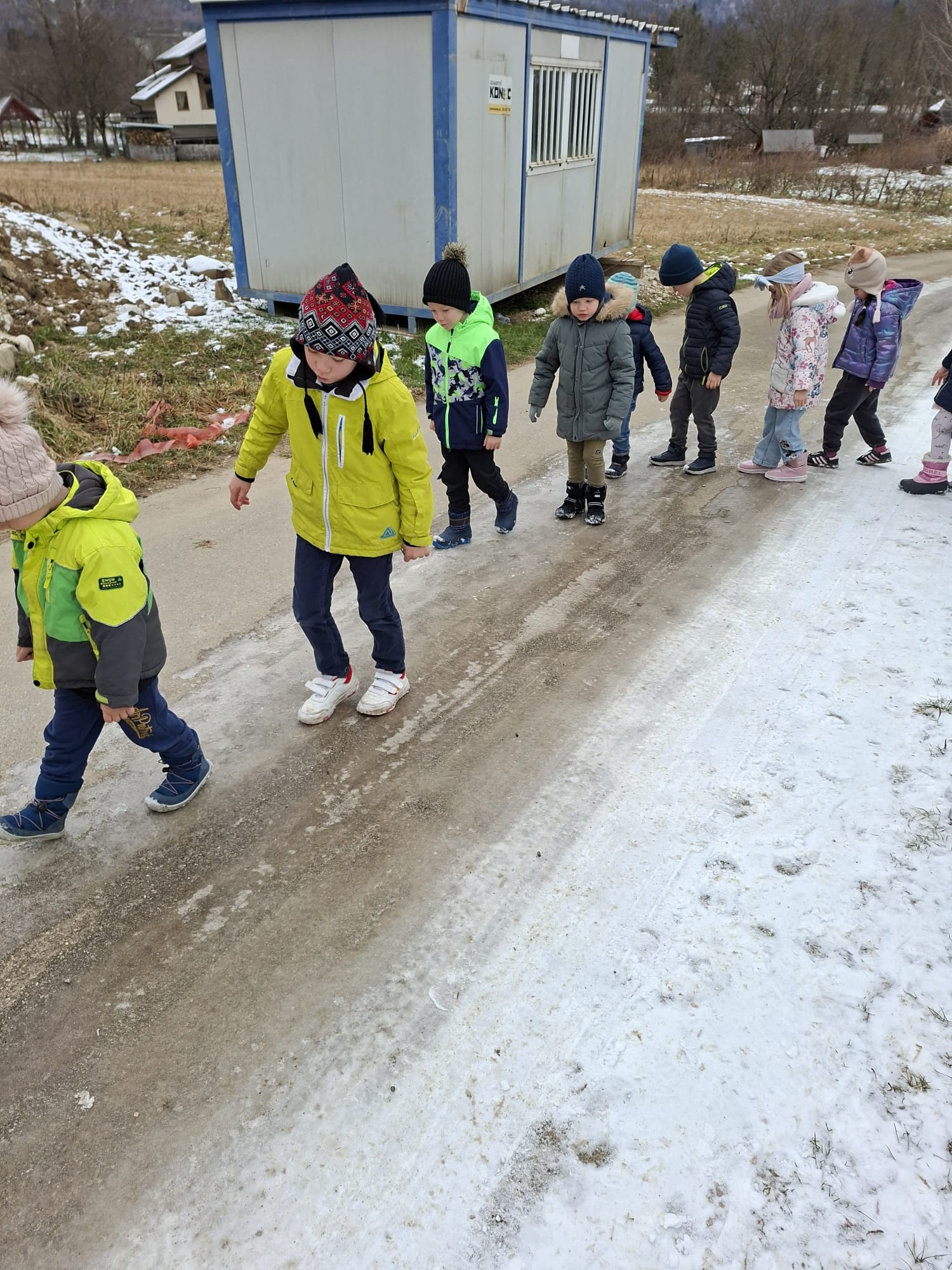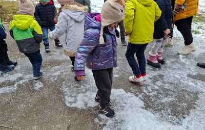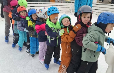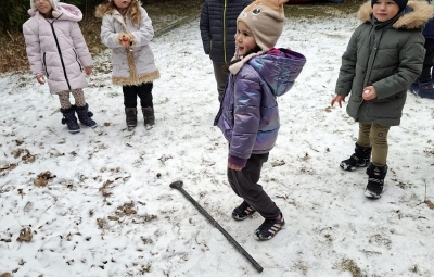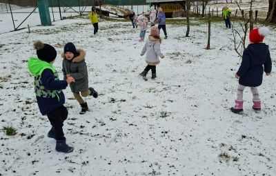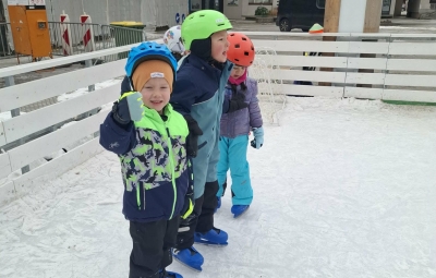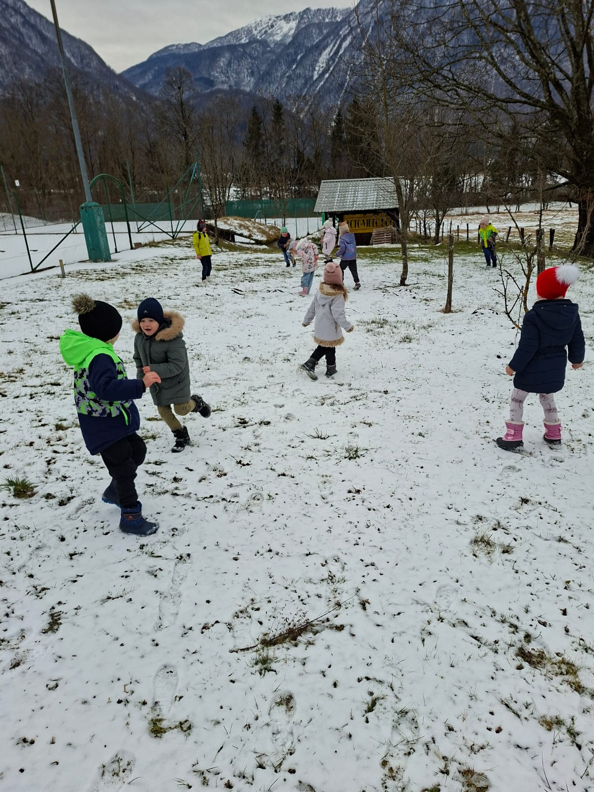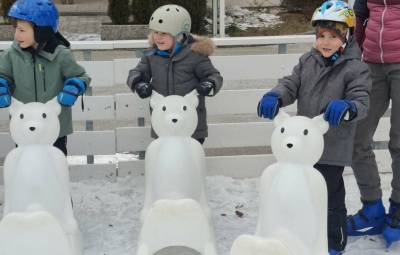 V mesecu januarju bomo veliko pozornosti posvetili zimskim športom. Spoznali bomo, kateri so vsi ti športi. Za začetek smo se posvetili drsanju, saj imamo v našem kraju čisto pravo drsališče. Konec praznikov nam je zima za pokušino natrosila malo snega, tako,,da smo se v ponedeljek odpravili na sprehod  v okolico vrtca, kjer smo hodili po zasneženih travnikih, opazovali naše sledi, delali kepe in z njimi ciljali, se kepali, opazovali sledi živali v snegu in se tudi malo drsali po ledu, ki je nastal na poti. Drsali smo se kar z našo zimsko obutvijo, ki smo jo ta dan imeli obuto.