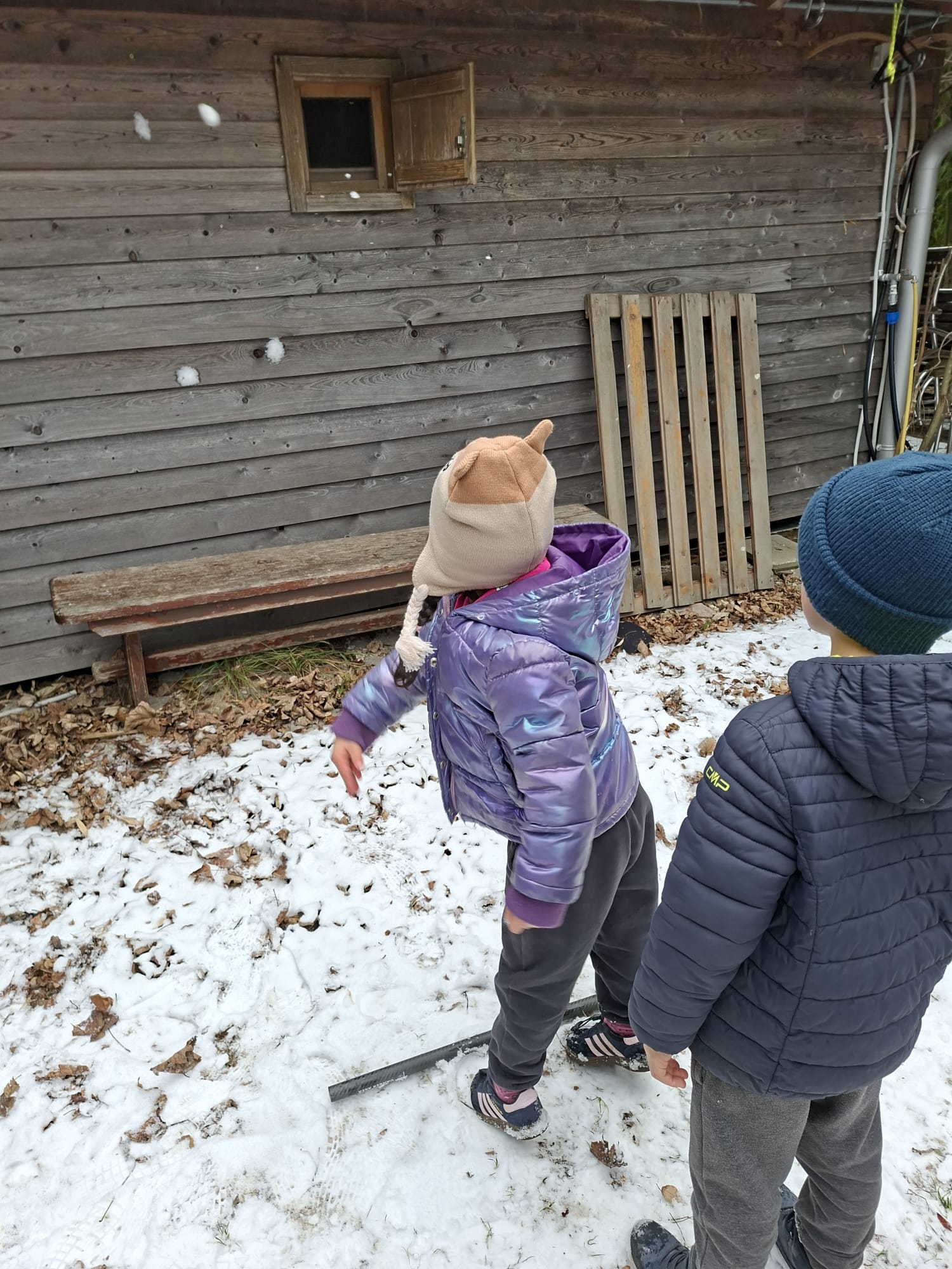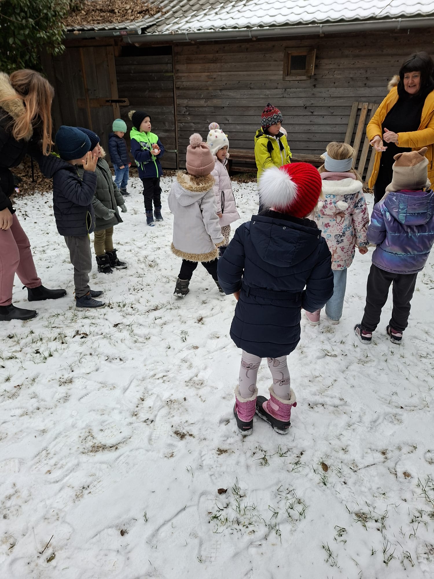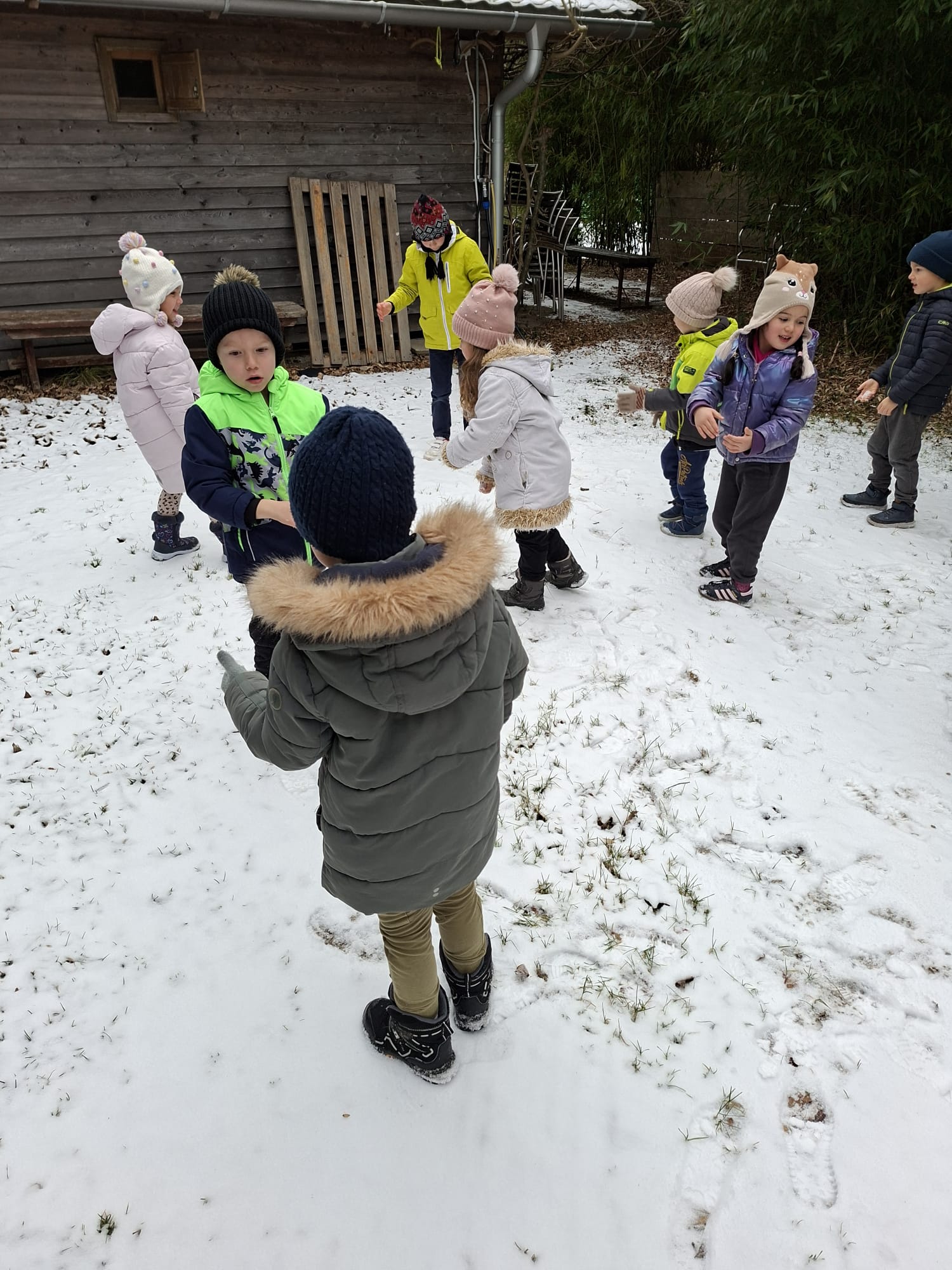 V mesecu januarju bomo veliko pozornosti posvetili zimskim športom. Spoznali bomo, kateri so vsi ti športi. Za začetek smo se posvetili drsanju, saj imamo v našem kraju čisto pravo drsališče. Konec praznikov nam je zima za pokušino natrosila malo snega, tako,,da smo se v ponedeljek odpravili na sprehod  v okolico vrtca, kjer smo hodili po zasneženih travnikih, opazovali naše sledi, delali kepe in z njimi ciljali, se kepali, opazovali sledi živali v snegu in se tudi malo drsali po ledu, ki je nastal na poti. Drsali smo se kar z našo zimsko obutvijo, ki smo jo ta dan imeli obuto.