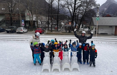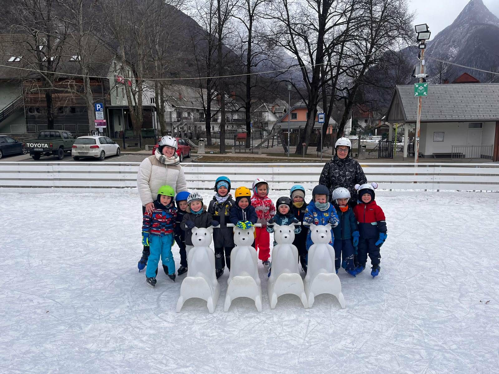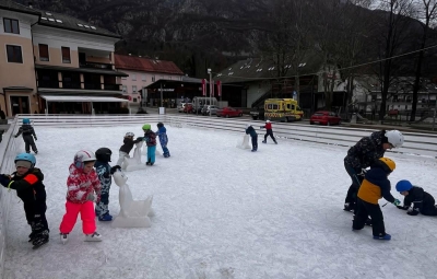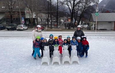 V torek, 6.01.2026, smo se kljub vetrovnemu dnevu "Zajčki" pogumno podali na drsališče. Bil je pravi občutek zime, saj smo imeli rdeča lička od mraza, okrog nas pa je naletaval sneg. Najprej smo preverili predznanje otrok in ugotovili, da so od lanskega leta zelo napredovali in so že skoraj vsi samostojno drsali. Kar je za to starost pohvalno. Tako sva z vzgojiteljico Kajo pomagali otrokom, ki so jo še potrebovali ali pa so vzeli drsalnega medvedka za pomoč. Najprej smo drsali prosto, nato naredili kratek slalom, sledila je drsalna revija s fotografiranjem in skupinsko fotografijo. Nareviji sva sw predstavili tudi vzgojoteljici s svojima točkama. Za konec smo še prosto drsali.