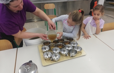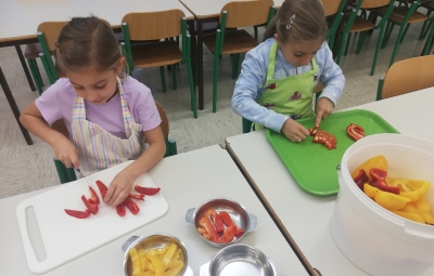 Izdelali so zelenjavni namaz. Pri tem so pridno rezali zelenjavo in se podučili, da je zelenjava z domačega vrta ali okolja najboljša. Spoznali so, da se morajo kuharice in kuharji vsak dan potruditi, da pripravijo zdravo malico in kosilo za vse otroke.