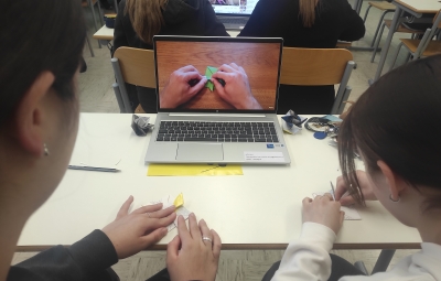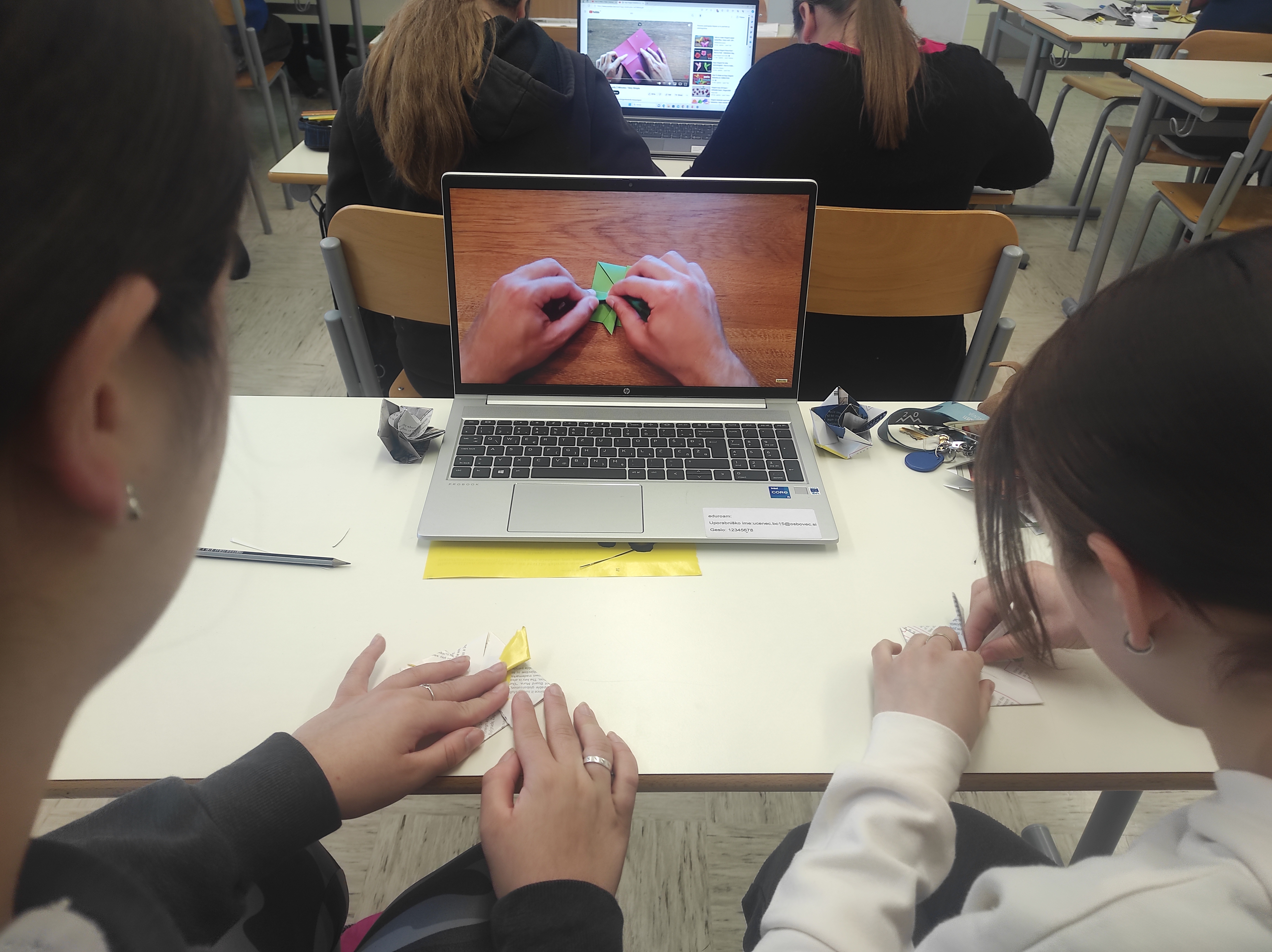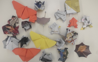 V delavnici origami so učenci izdelovali okraske iz papirja, žabe, ki naj bi skakale, vrtnice, metulje, ptice in dežniček. Pri izdelovanju žab so tekmovali, kdo naredi bolj poskočno žabo, torej žabo, ki skoči najdlje.