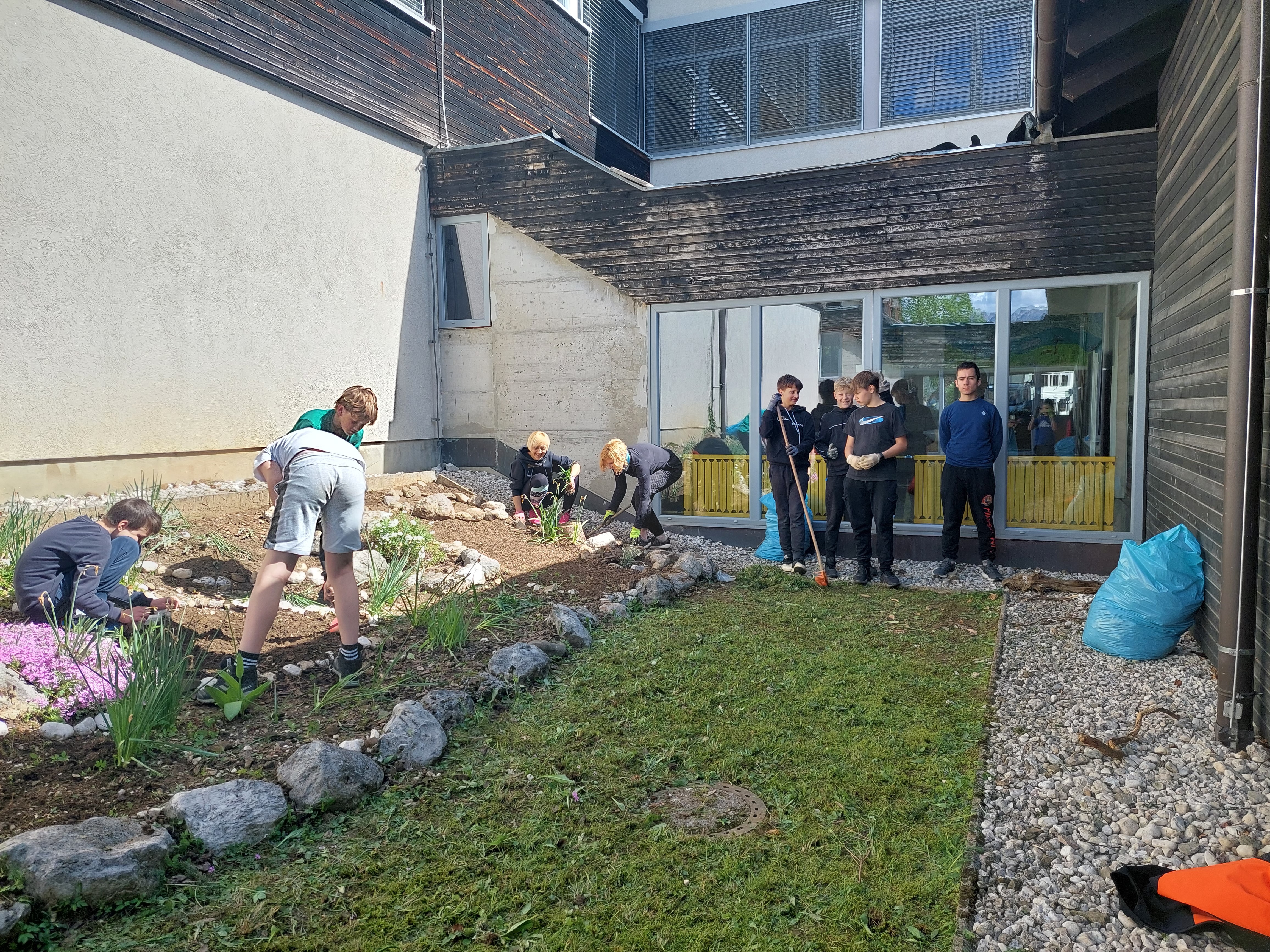 Skupina učencev je čistila atrijski skalnjak, prekopavala gredice in odstranjevala plevel.