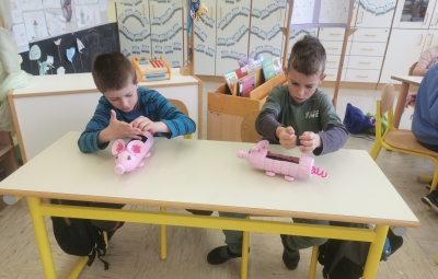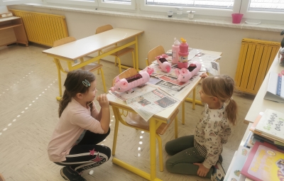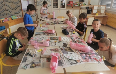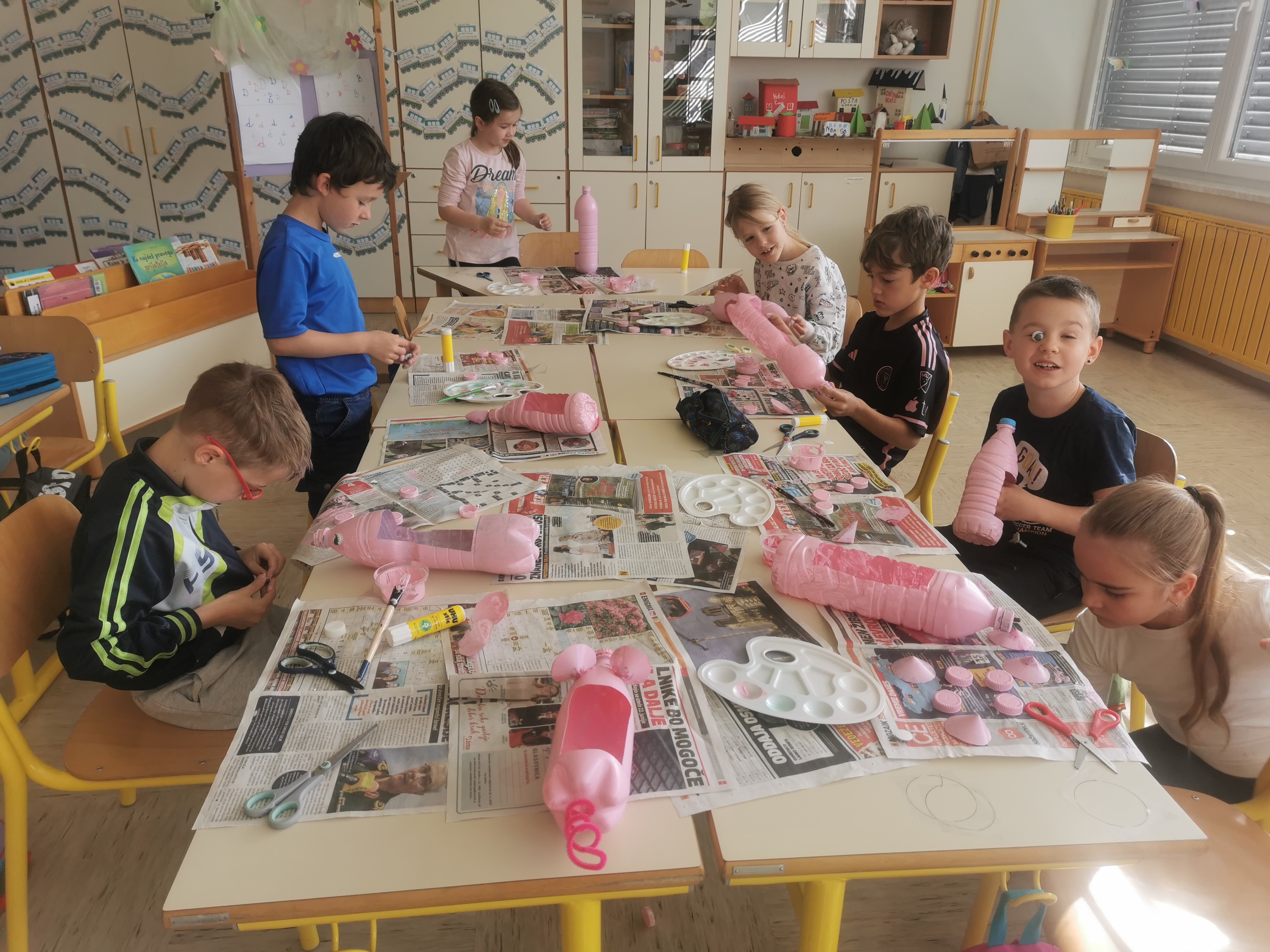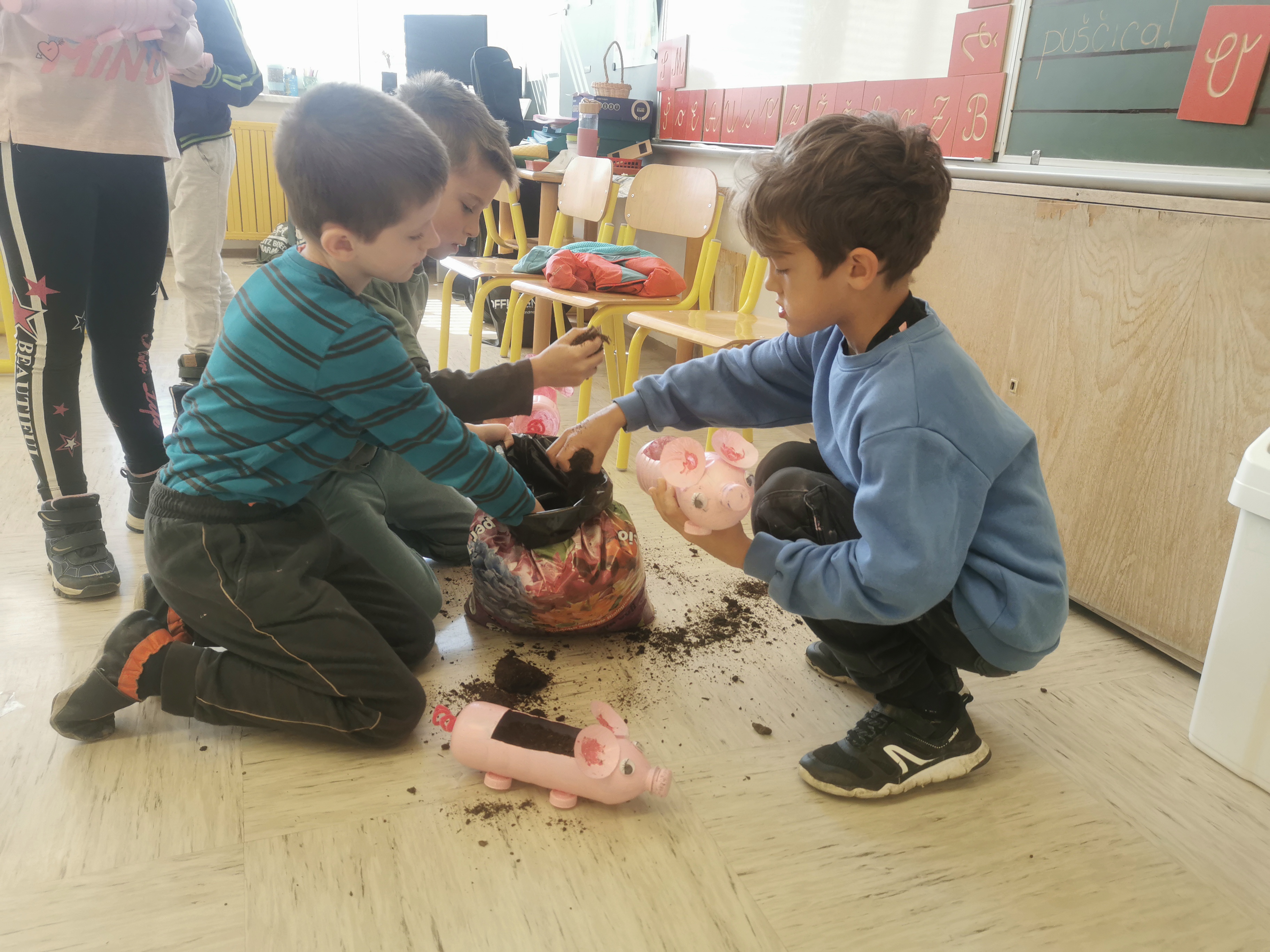 Drugošolci so iz odpadne embalaže plastenk izdelali prašičke, jih napolnili z zemljo in vanjo posejali semena, iz katerih bodo zrasle lepe rožice. Ogledali so si tudi film o recikliranju odpadkov in o tem, kako zavržemo preveč hrane.