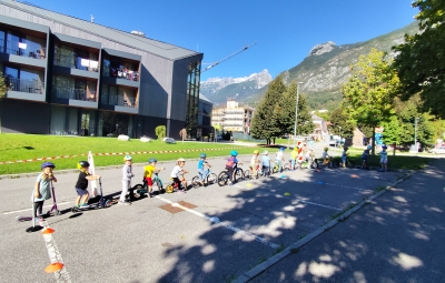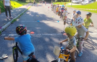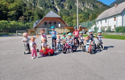 V Evropskem tednu mobilnosti, ki je potekal od 16. do 22. septembra, pod sloganom "Mobilnost za vse", smo se otroci vrtca Bovec in podružnične enote Žaga, vsak po svoje vključevali v različne aktivnosti. Skozi teden smo se v cestno prometni režim vključevali kot pešci, sopotniki v avtomobilih, kolesarji in tudi le kot opazovalci dogajanja v prometu. Opazovali smo prometne znake in simbole na cesti, iskali poti ki so varne za naše male korake, ter prepoznavali prevozna sredstva, ki vozijo po naših cestah. Ob tem pa bili vidni, previdni in vzgledni s svojim varnim vedenjem. Za zaključek tega tedna je poskrbela redarska služba, predvsem redar Janko, ki nam je omogočil postavitev poligona kar na enem delu cestišča. Za ves promet so zaprli del ceste in parkirišče pod vrtcem, ter nam dostavili različne pripomočke, s katerimi smo si ustvarili svoj poligon, svojo varno pot. Tokrat nismo bili le opazovalci in pešci, ampak smo se na njem preizkusili s kolesom, skirojem in poganjalcem. Nismo pozabili na pomemben del opreme, na čelado, ki varuje naše male glavce. Poligon smo premagovali z veliko mero strpnosti in previdnosti, upoštevali znake, ki so nas usmerjali, ter vano vozili med ovirami. Dan smo zaključili še z ogledom dogajanja na placu, kamor smo se odpravili le otroci skupin v Bovcu. Bil je lep, poučen dan.