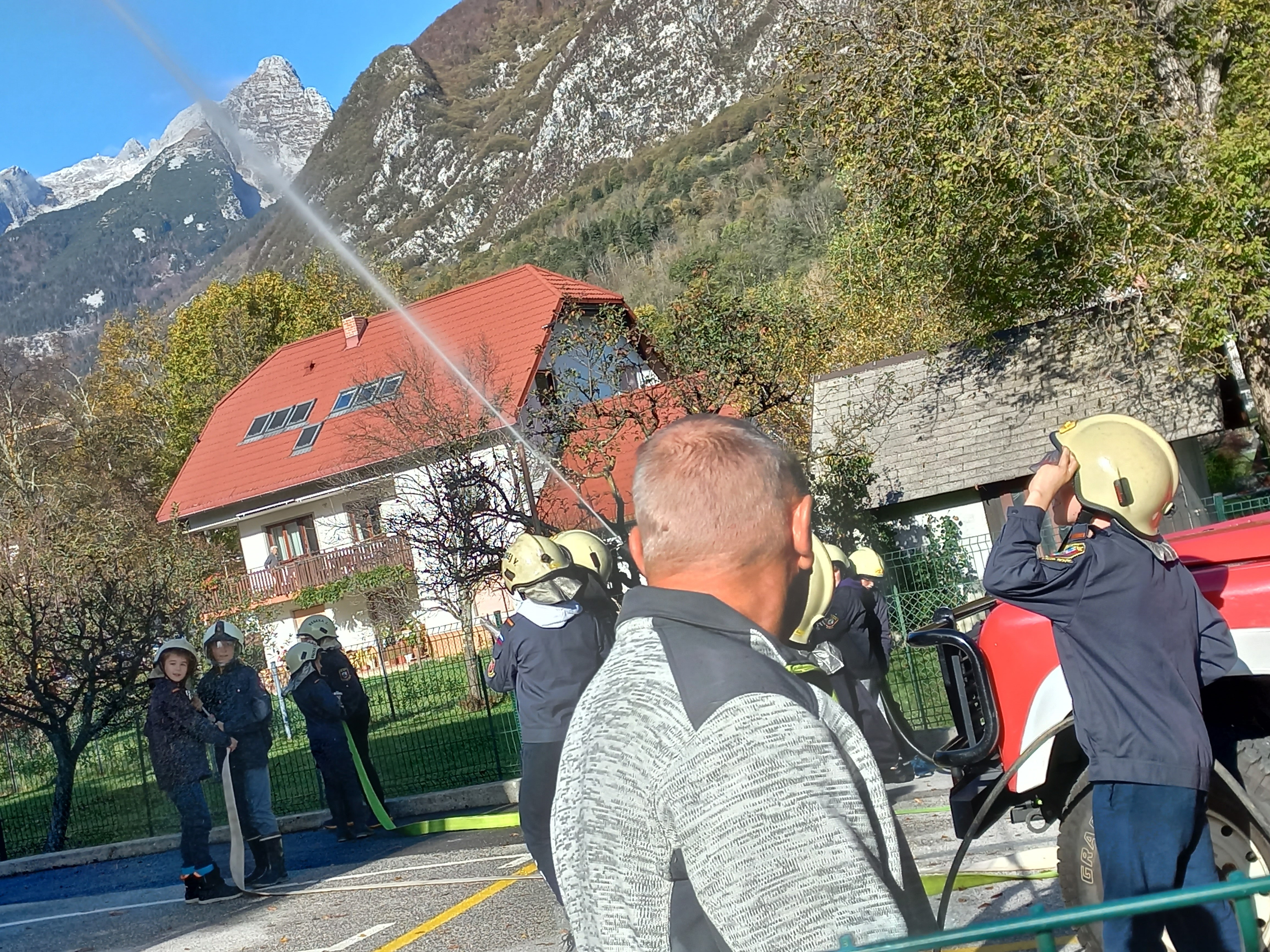 Iuiuiui ,iuiuiui, Iuiuiui,iuiuiui, za avtom rdečim se kadi, kakor formula drvi! Saj to ni avto kar tako, v njem gasilcev pet sedi! Naš vrtec pogasili so, zato še enkrat hvala vsem. Otroci in vzgojiteljice iz vrtca Bovec