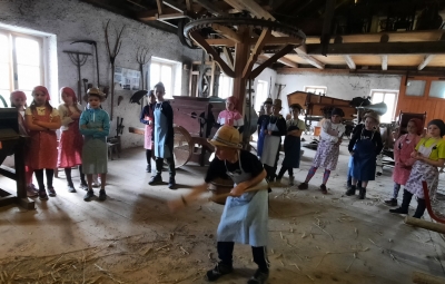 Tretješolci OŠ Bovec in učenci PŠ Soča smo se odpeljali na Ledine nad Spodnjo Idrijo. Prijazna gospodarja kmetije Pr Jureč sta nam predstavila pot "od zrnja do kruha". Preizkusili smo se v nekaterih kmečkih opravilih.