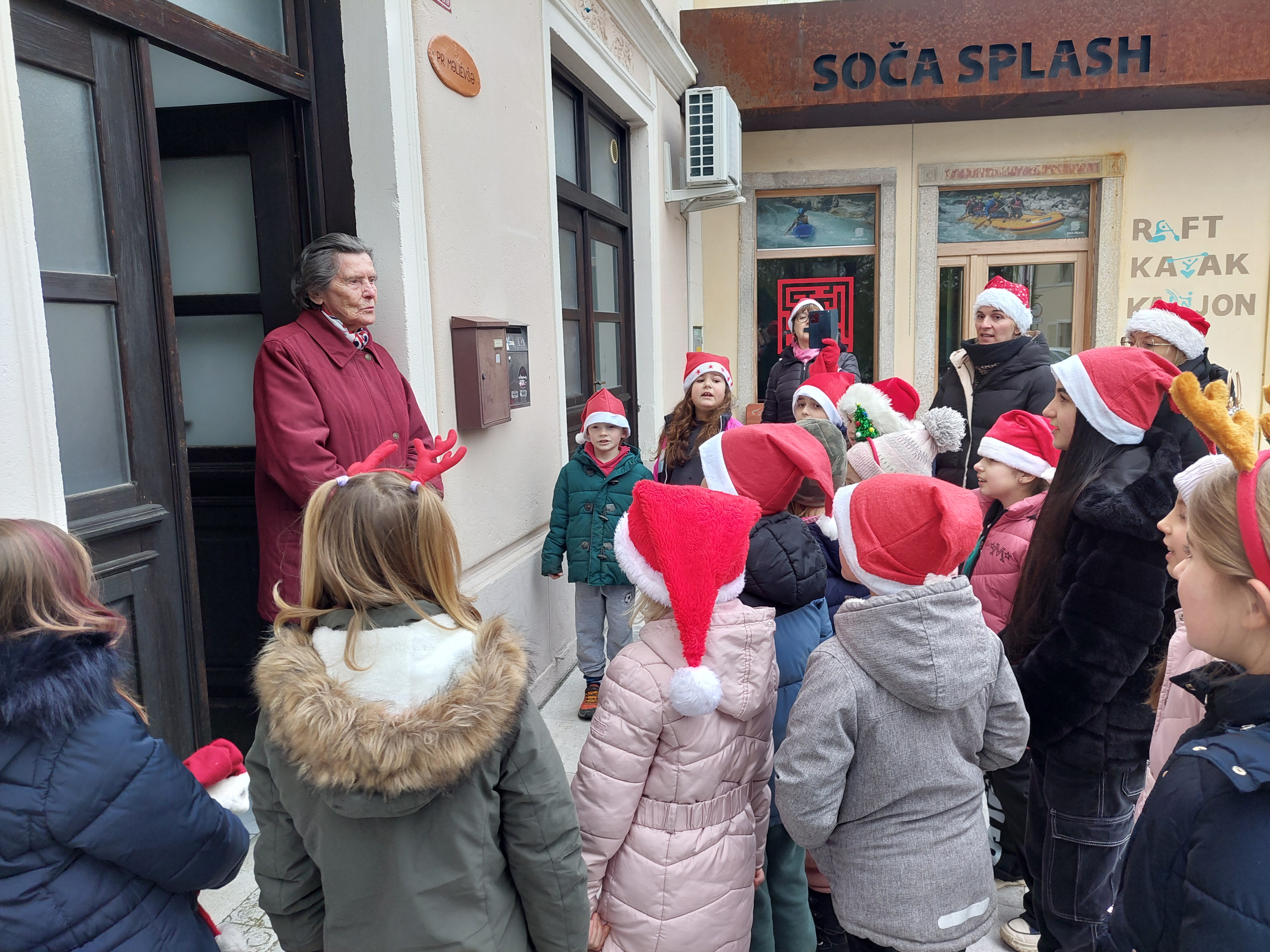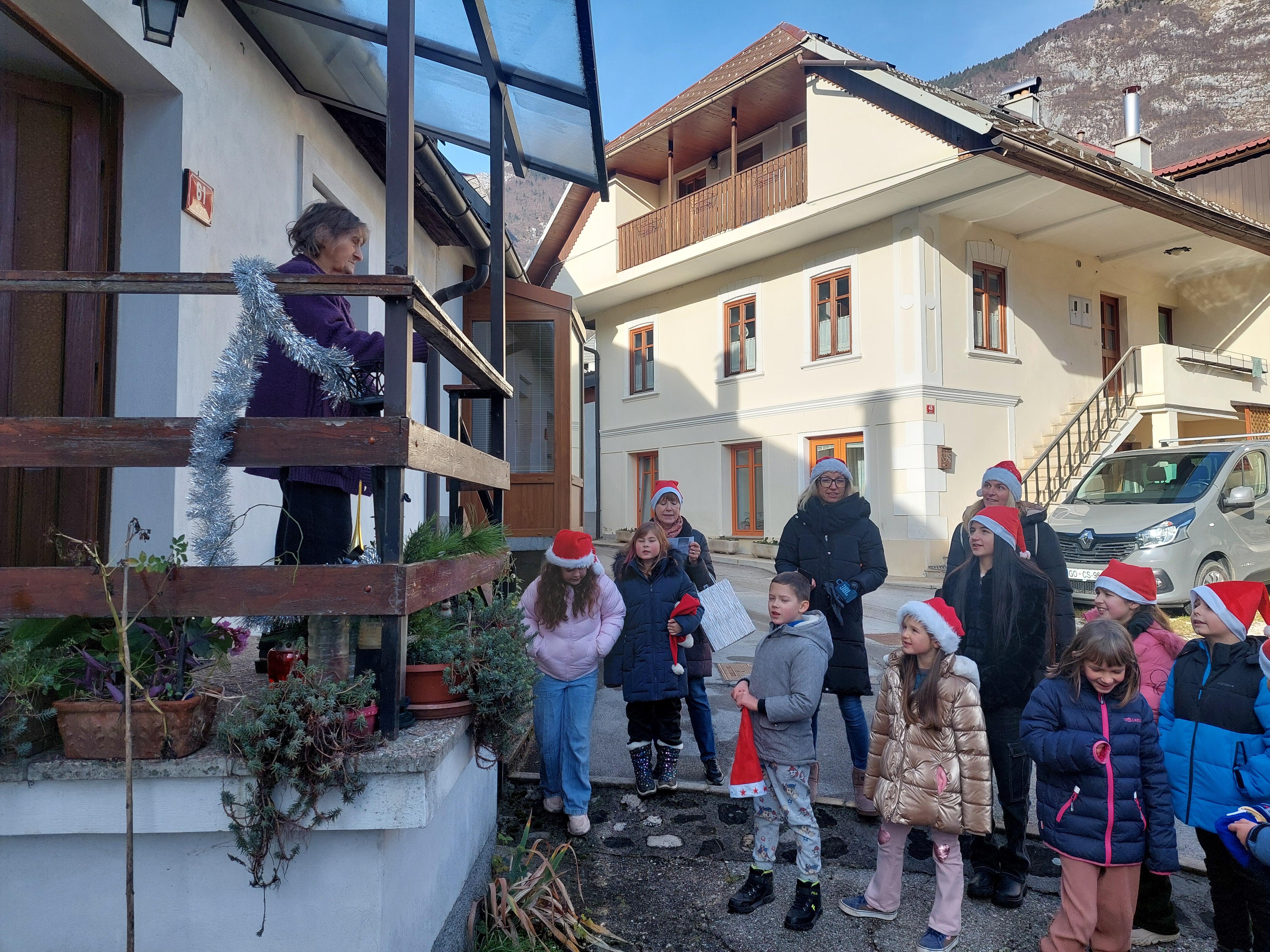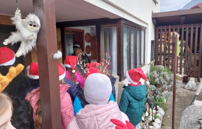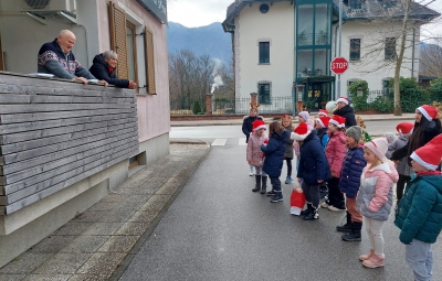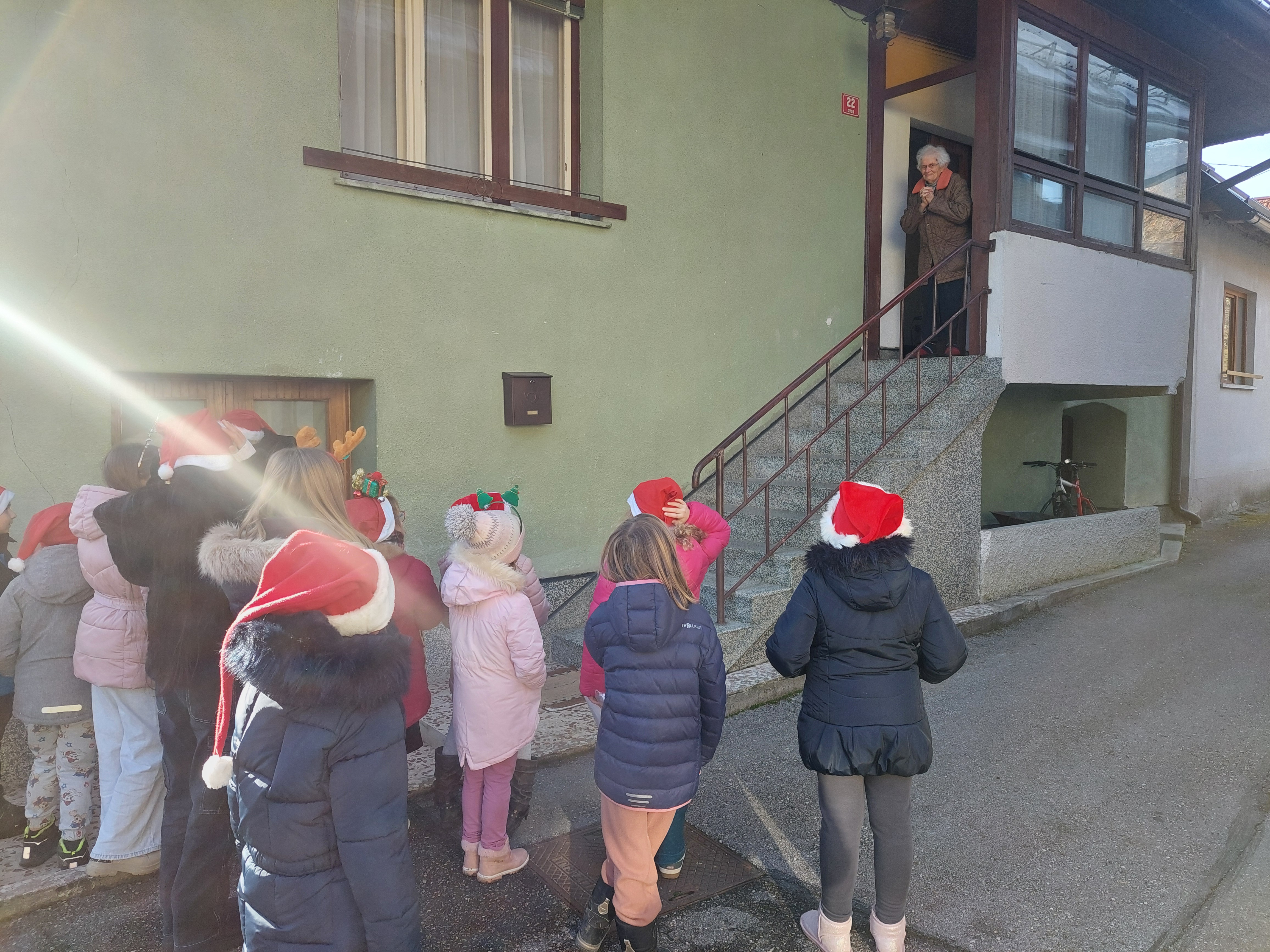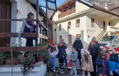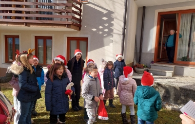 Tudi letos smo z otroškim pevskim zborom pod mentorstvom učiteljic Daše Mlakar Komac in Andreje Šulin obiskali starostike starejše od 90 let. Veseli smo, da smo na njihove obraze pričarali nasmeh. Zaželeli smo jim mirne praznike in zdravo ter srečno novo leto 2026. S pesmijo smo dan polepšali tudi županu in zaposlenim na Občini Bovec. Iskreno se zahvaljujemo ga. Nadi Mrakič, ki nam vsako leto pomaga organizirati obiske pri naših starostnikih.