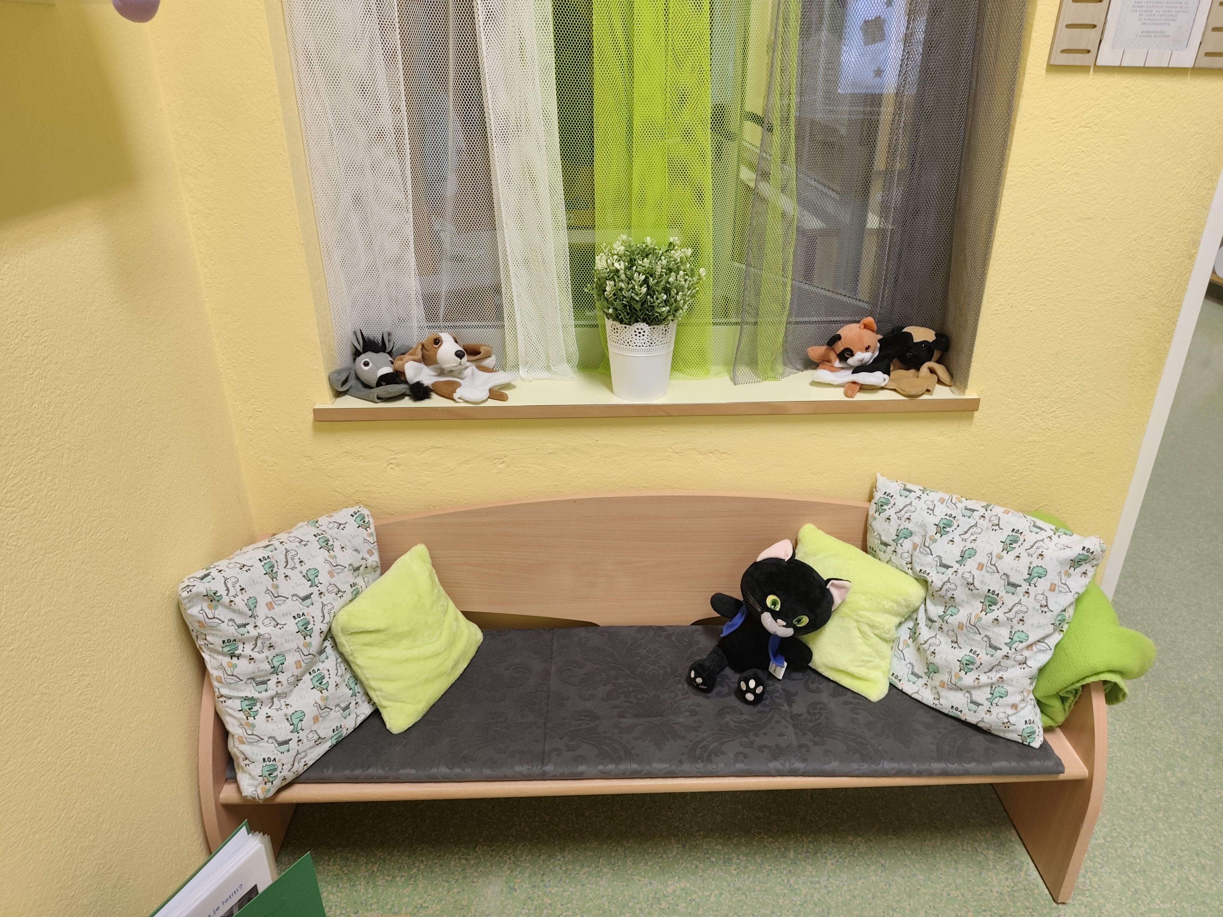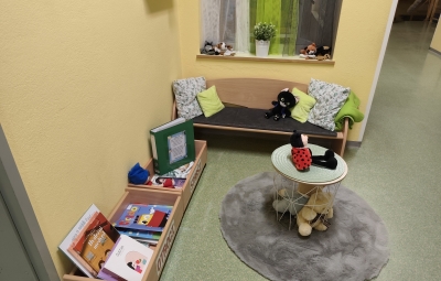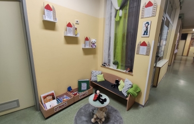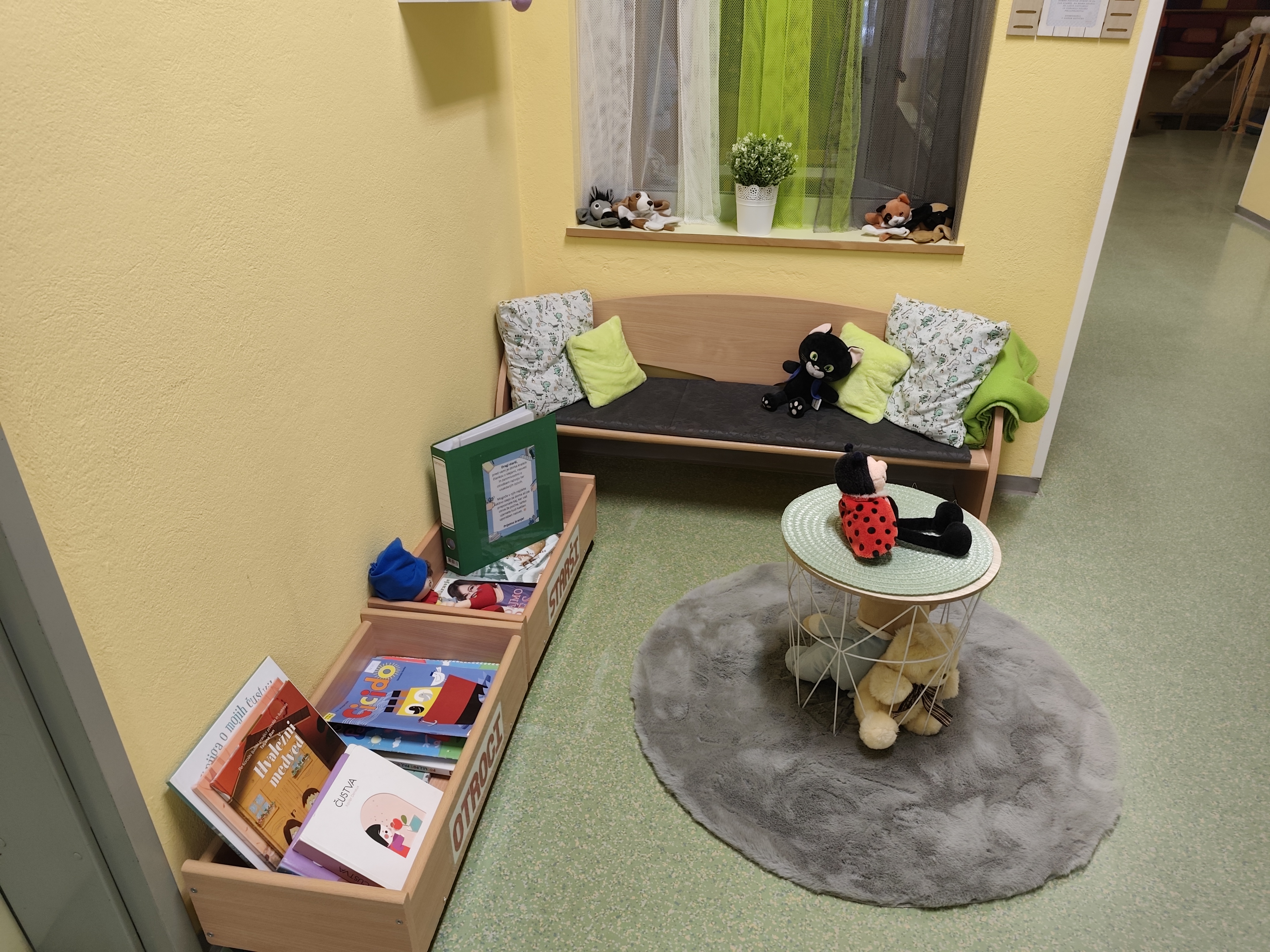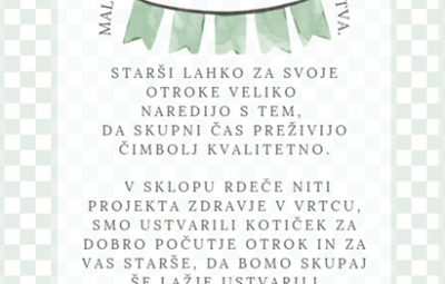 Naš vrtec je v tem tednu dobil končno podobo kotička za dobro počutje, za starše in otroka. Opremili smo ga v prijaznem tonu z namenom, da ustvarimo prijeten in miren prostor, kjer si lahko skupaj z otrokom vzameta nekaj časa drug za drugega. To je kotiček za umiritev ob koncu dneva, za povezovanje, za skupne pogovore, branje, ustvarjanje ali samo potrebno bližino. V njem vas čakajo pravljice in slikanice s vsebino o dobrem počutju in čustvih, ročne lutke, didaktične igrače, nekaj je tudi strokovnih člankov za starše, revije,... Tedensko bo opremljen z lepo mislijo o otrocih in pozitivno motivacijo za starše. Veseli bomo, če se v nem ustavite, posedite, preberete kakšno pravljico, ali si le vzamete čas za skupno druženje.
