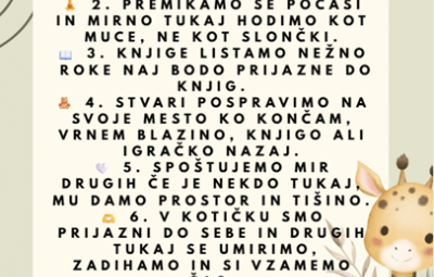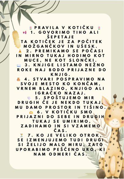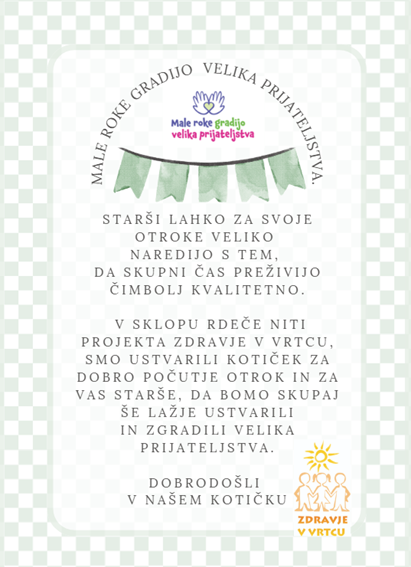 Kotiček smo opremili s pravili, da se bomo v njem čimboljše počutili, ter ob tem skrbeli, da bo vedno urejen in pospravljen. Ker smo kot vrtec vključeni v projekt Zdravje v vrtcu, smo s tem naredili še en korak naprej, da prispevamo k dobremu počutju v našem vrtcu. Rdeča nit letošnjega leta nas vodi, da z majhnimi rokami že gradimo velika prijateljstva, k temu pa naj pripomore tudi skupni prostor.