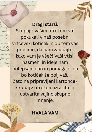 Želimo vam veliko lepih skupnih trenutkov v našem vrtcu ter tudi našem kotičku.
