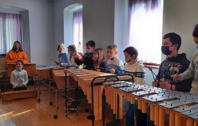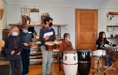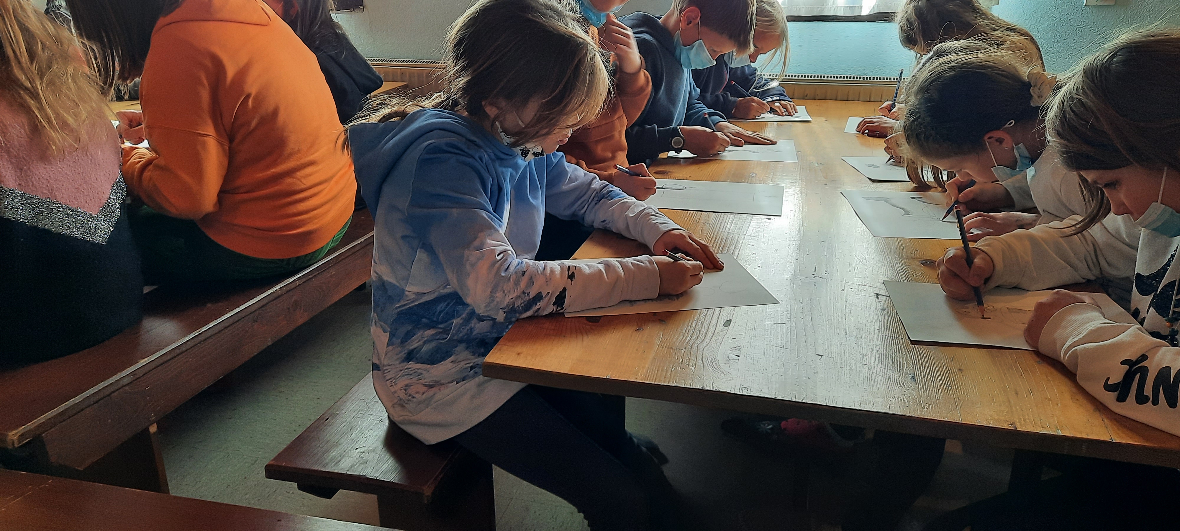 Učenci 5.razreda iz Bovca in učenci Podružnične šole Soča smo odkrivali sozvočja v svetu glasbe ter spoznavali skrivnosti velikih slikarjev v Groharjevi hiši v Sorici.