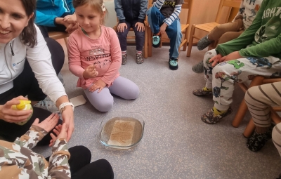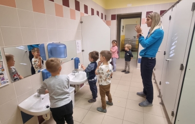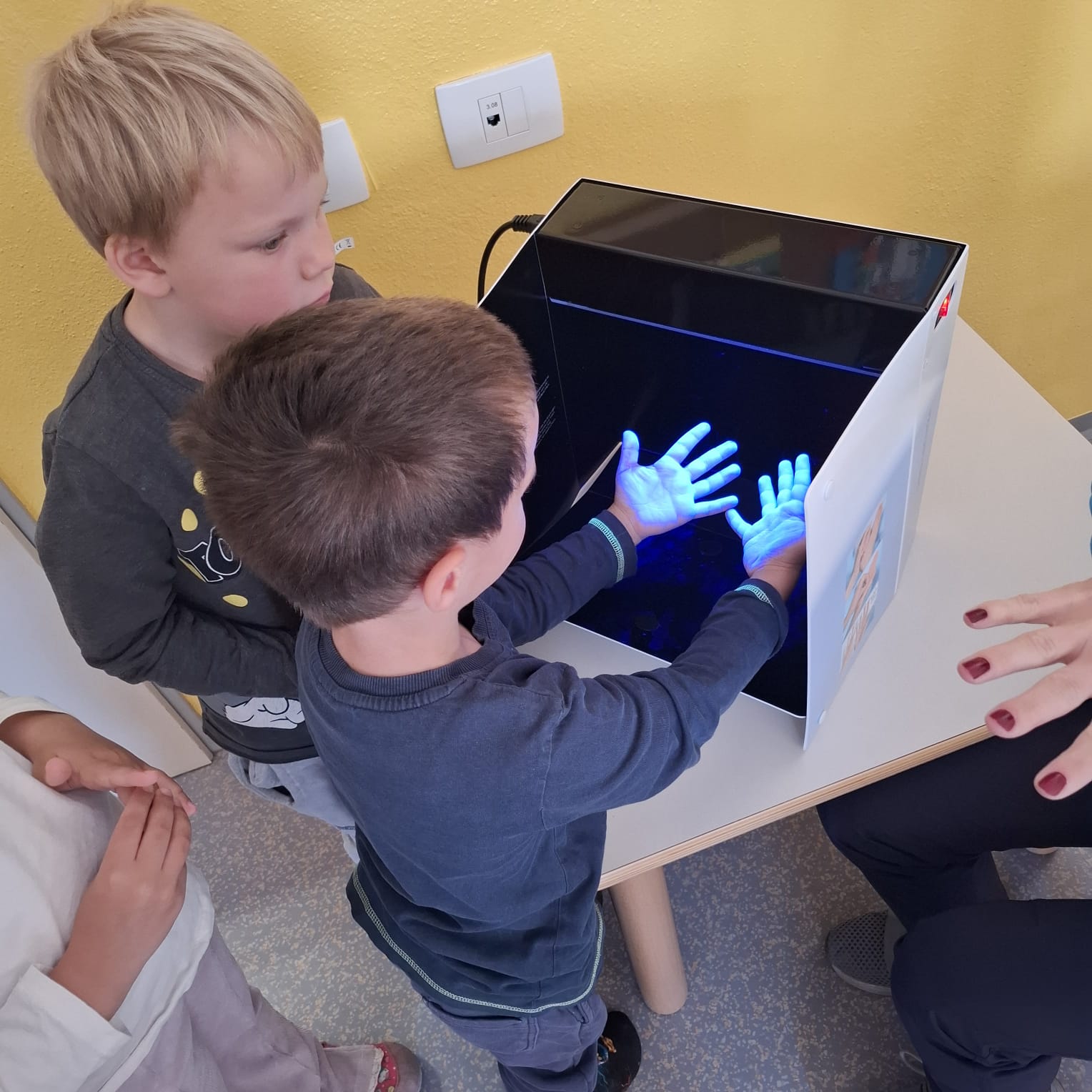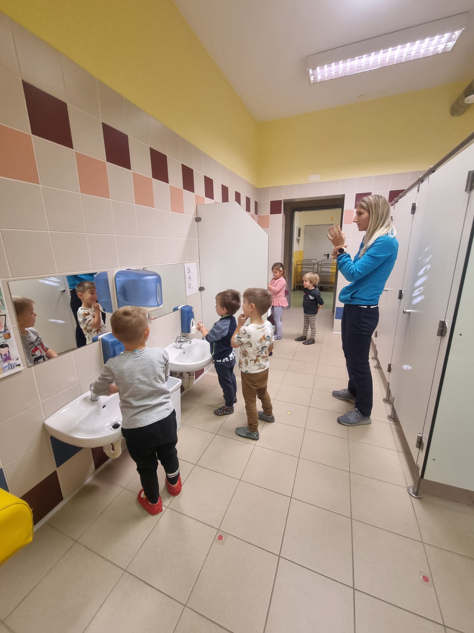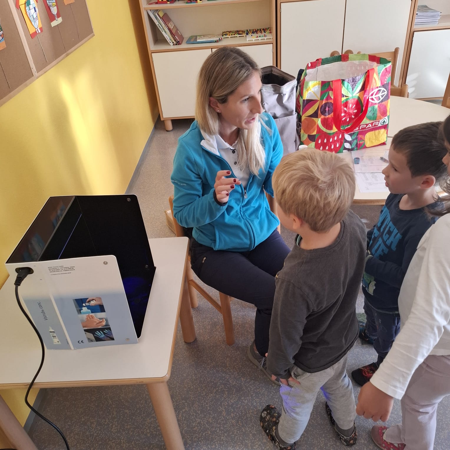Zato je pomembno umivanje rok. Povedali smo, kdaj vse jih umivamo. Z zgodbico o vožnji traktorja smo se naučili, kako pravilno umivamo roke, nato smo to preizkusili še v praksi in pod lučko preverili, kako dobro smo si jih umili - koliko škratov je ostalo na naših rokah.