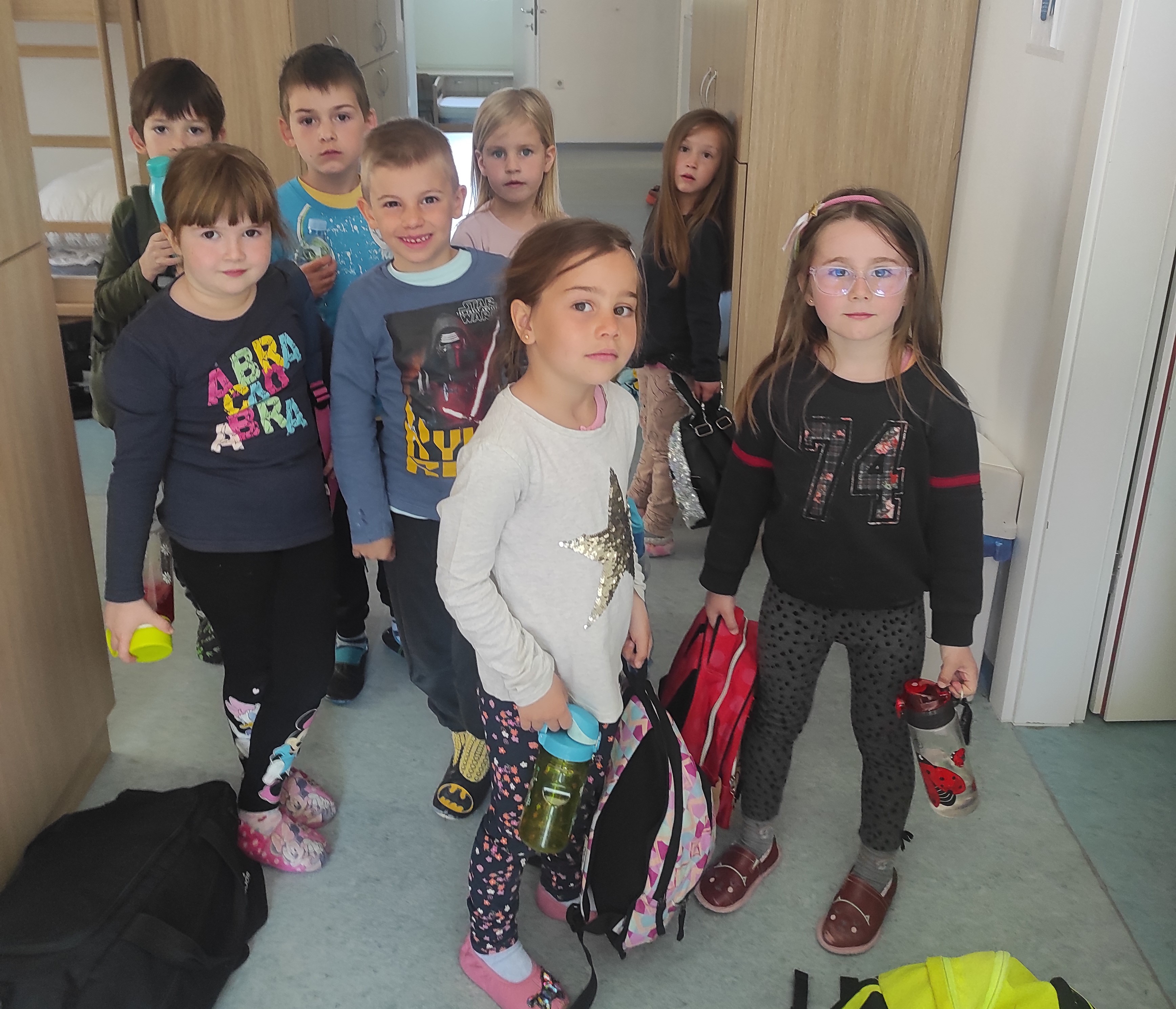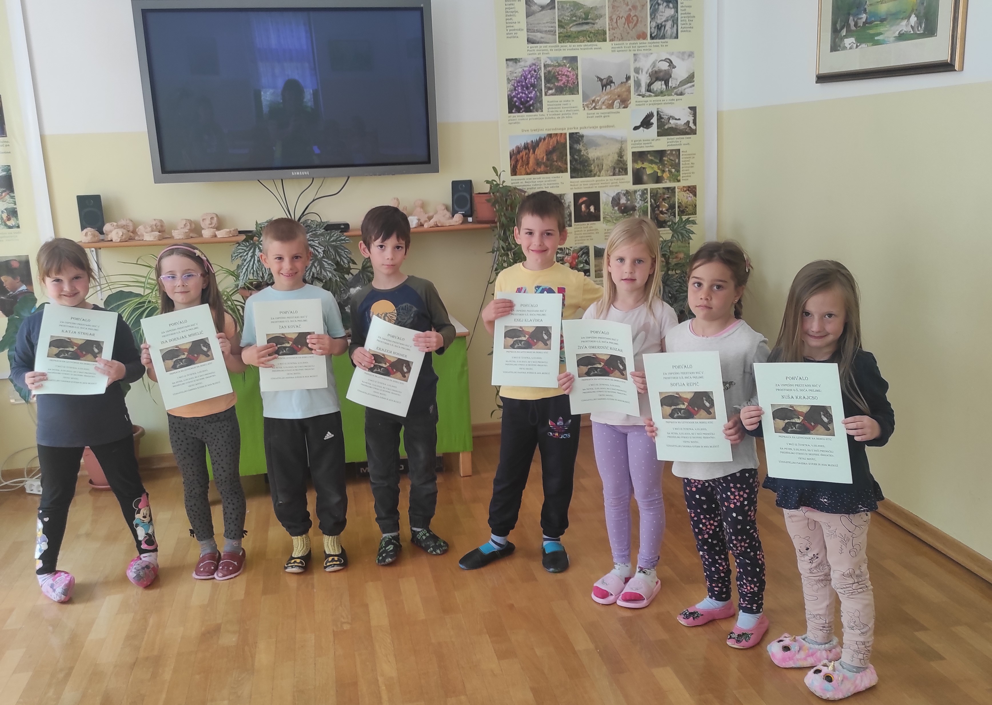 Vrnili smo se ravno na kosilo, nato pa smo ob prisotnosti otrok iz prvega razreda otrokom iz vrtca podelili diplome za uspešno prespano noč v prostorih Šole Soča kot predpriprava ne letovanje na Debelem Rtiču, ki ga bomo izvedli od 22.05. do 25.05.2023. Nagradili smo jih z bučnim aplavzom.