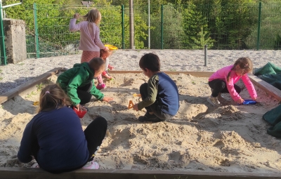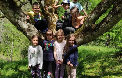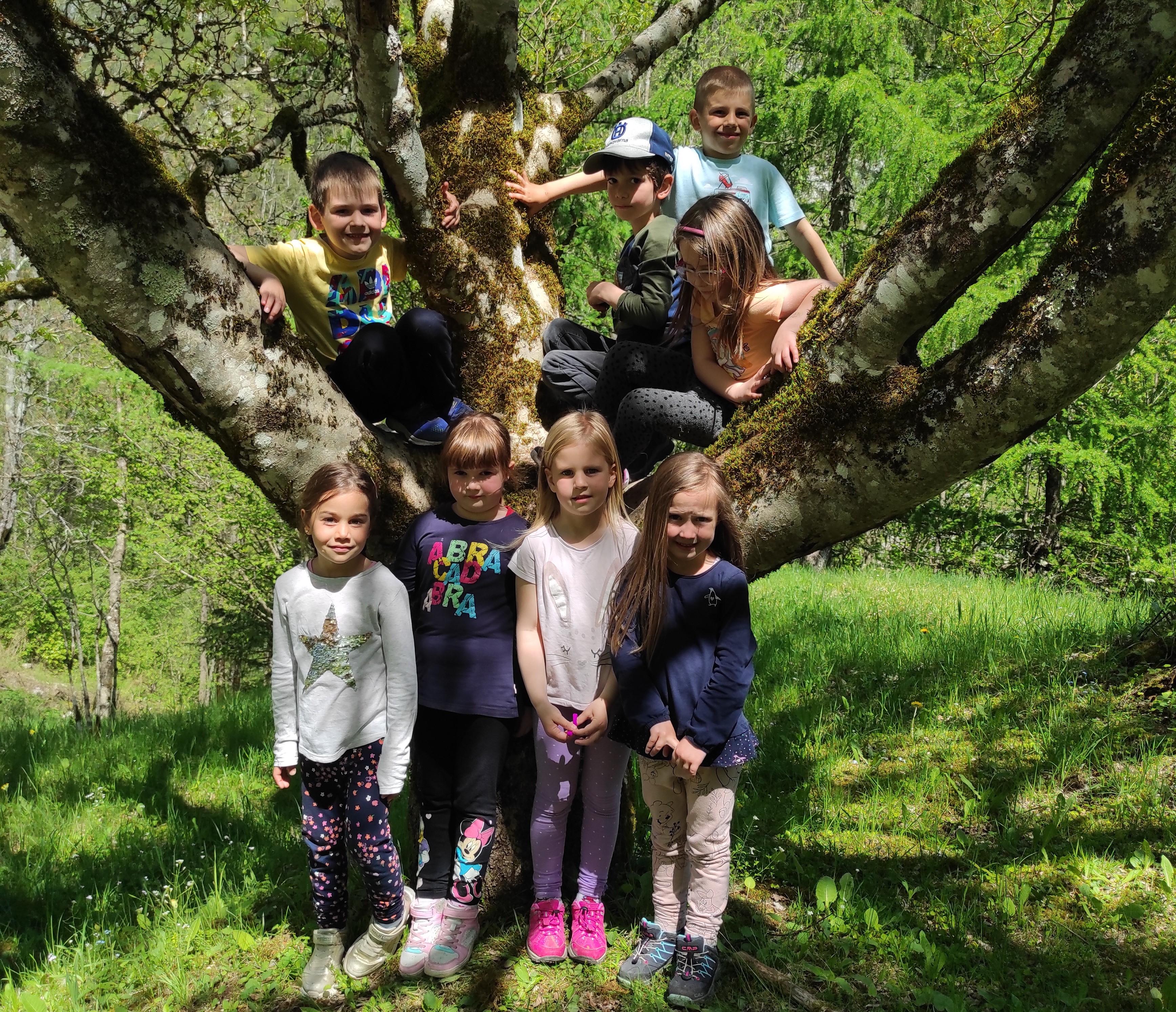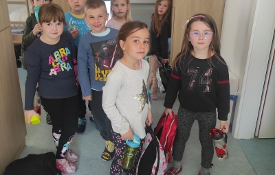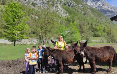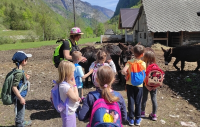 Škratki smo se v četrtek, 4.5.2023, po kosilu odpeljali do Lepene. Od tu smo pot nadaljevali peš mimo Pristave Lepena, kjer smo si ogledali živali in se igrali na prostranem travniku, nato pa krenili proti vasi Soča. Na poti nas je pozdravil tudi rjavi gož!