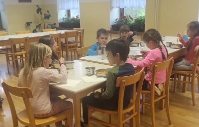 Prispeli smo do Podružnične šole Soča, si ogledali, kje bomo prespali in si čisto sami pripravili postelje. Medtem ko so se otroci igrali na šolskem dvorišču, je vzgojiteljica Ana pripravila slastno večerjo. Po njej pa smo se posladkali še s sladico, ki smo jo pripravili sami. Ker je bilo sladice s pudingom in piškoti dovolj, smo jo naslednji dan delili tudi s 1. razredom.