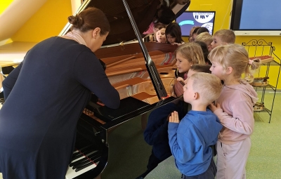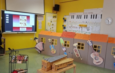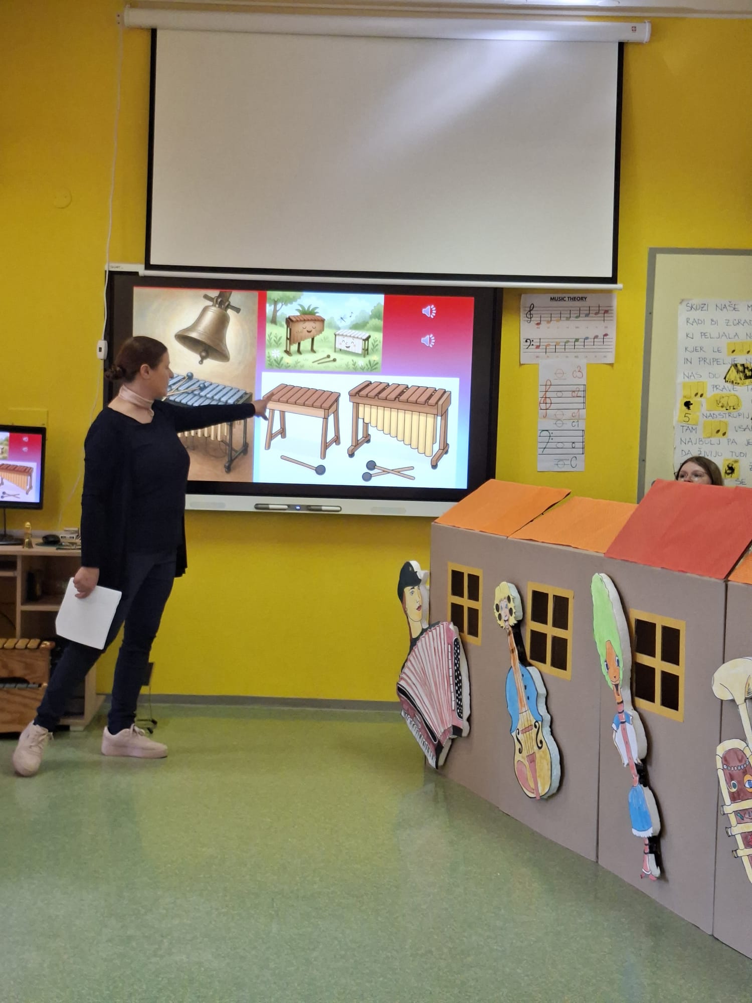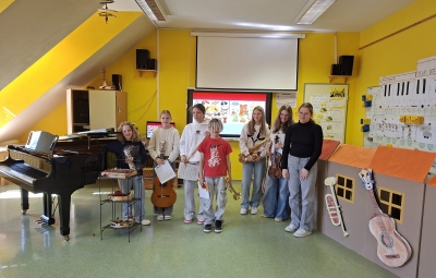 V sredo, 8.4.2026, je otroke iz skupin "Ptički" in " Zajčki" učiteljica glasbe, Katja Skočir, povabila v glasbeno šolo v Bovcu. Pripravila nam je predstavitev instrumentalnih skupin. Vsaka vrsta instrumentov je bila v svoji hišici. V eni hišici so bila predstavljena godala, v drugi pihala, tretji trobila, četrti brenkala, v peti tolkala in v šesti glasbila s tipkami. Na zabaven in igriv način nam je predstavila vse instrumente. Vsakega nam je v obliki rime opisala. Nekatere instrumente nam je predvajala na računalniku, da smo jih slišali in poslušali, nekaterim smo prisluhnili v živo, ko so nanje zaigrali učenci osnovne šole Bovec, ki obiskujejo glasbeno šolo. Igrali so kitaro, violino, prečno flavto, klavir, saksofon, trobento...