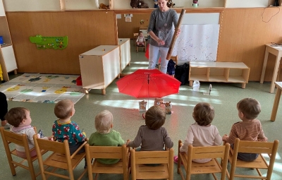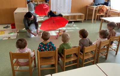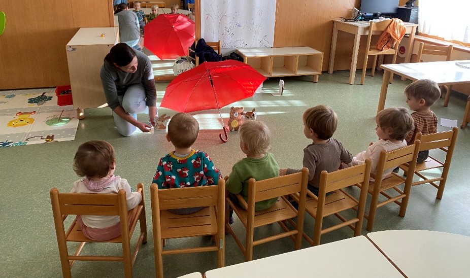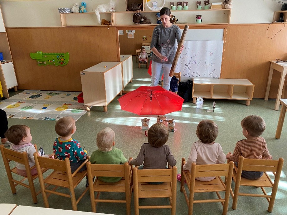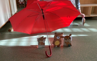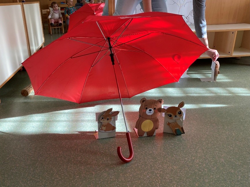 Pripovedovala in zaigrala nam je pravljico Pod medvedovim dežnikom. Otroci so jo zavzeto opazovali ter poslušali.