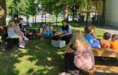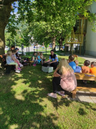 Skupino Škratki je v četrtek, 15. 6. 2023 obiskal policist, g. Matjaž Černuta.