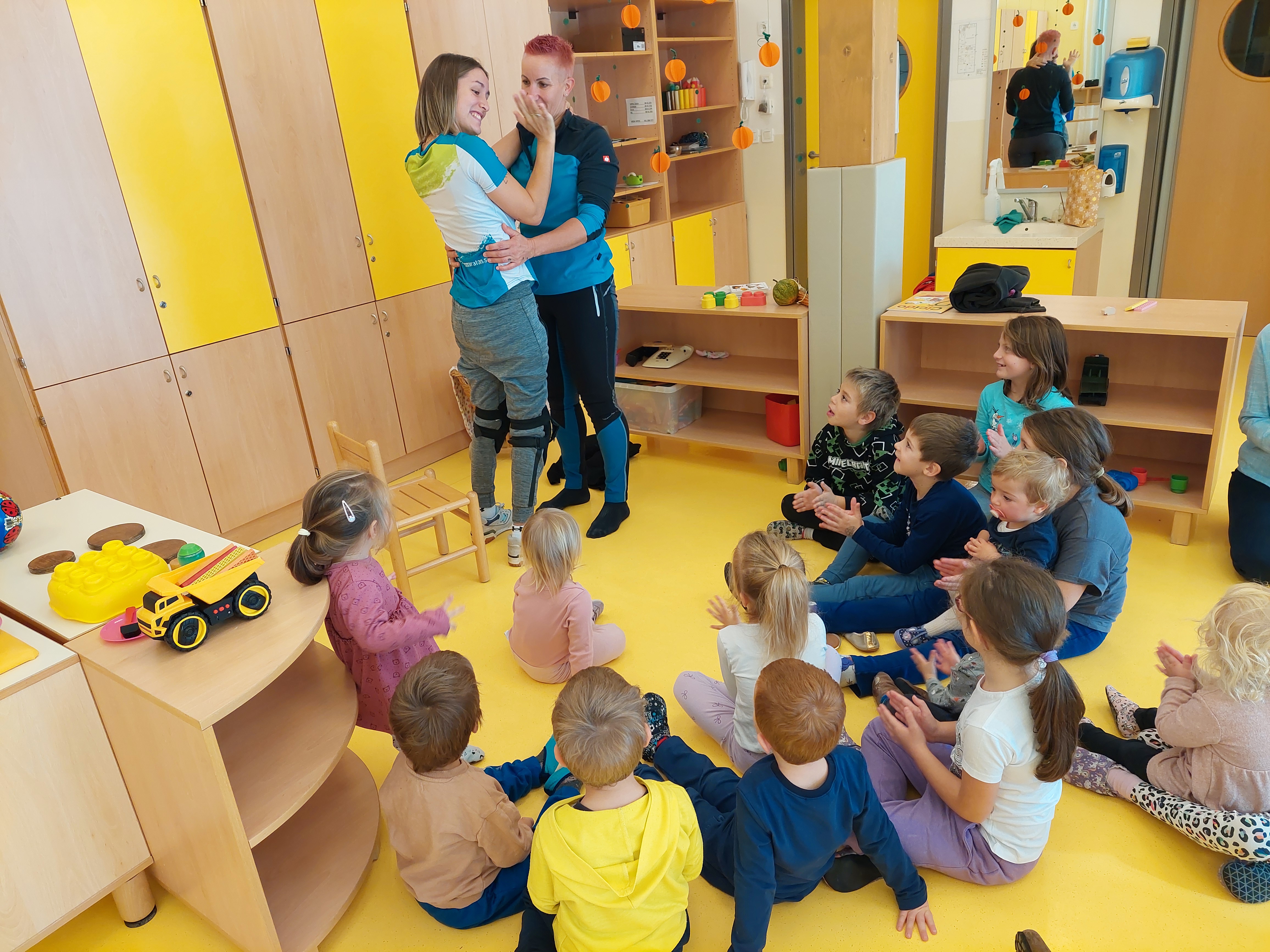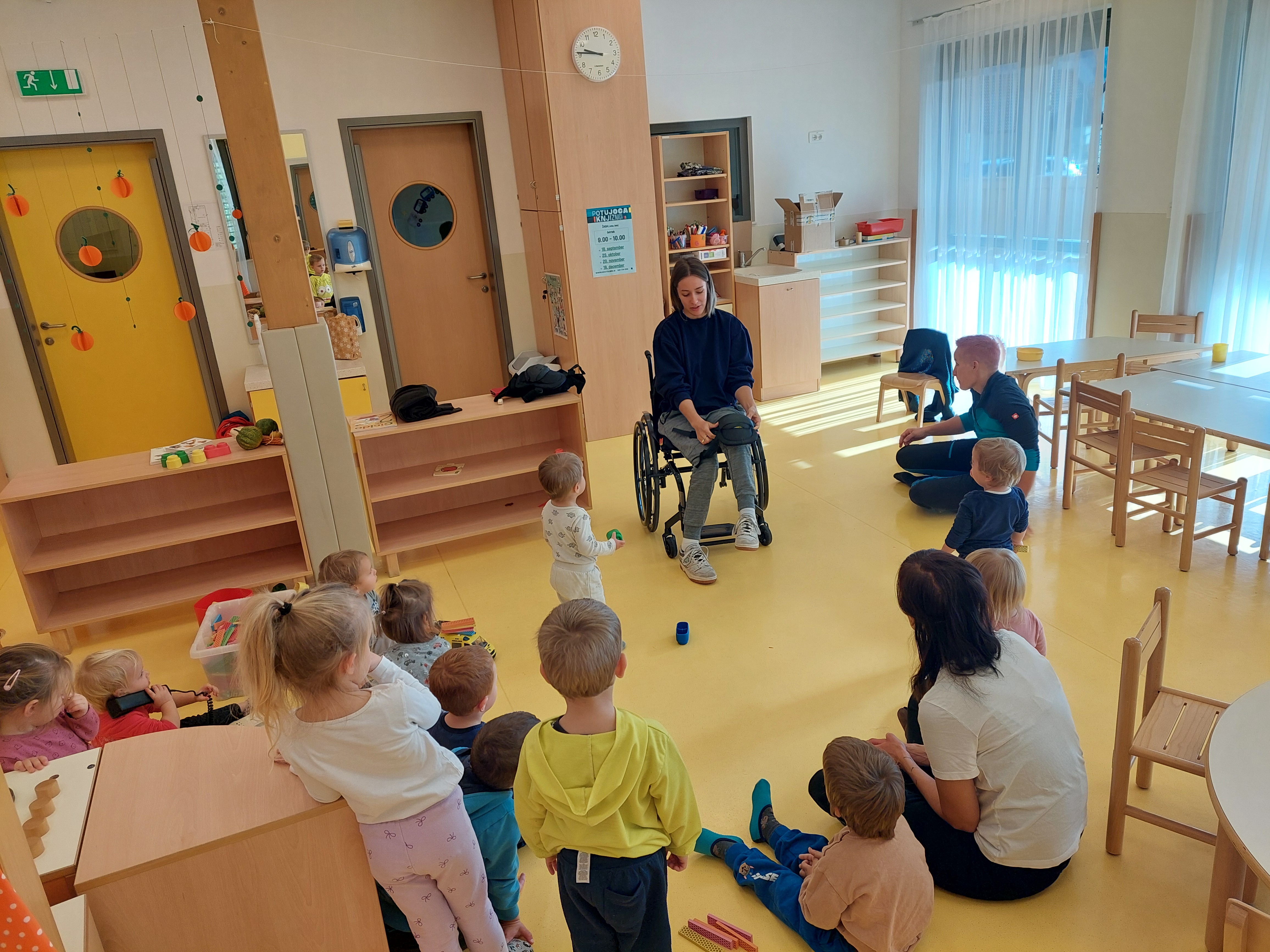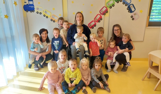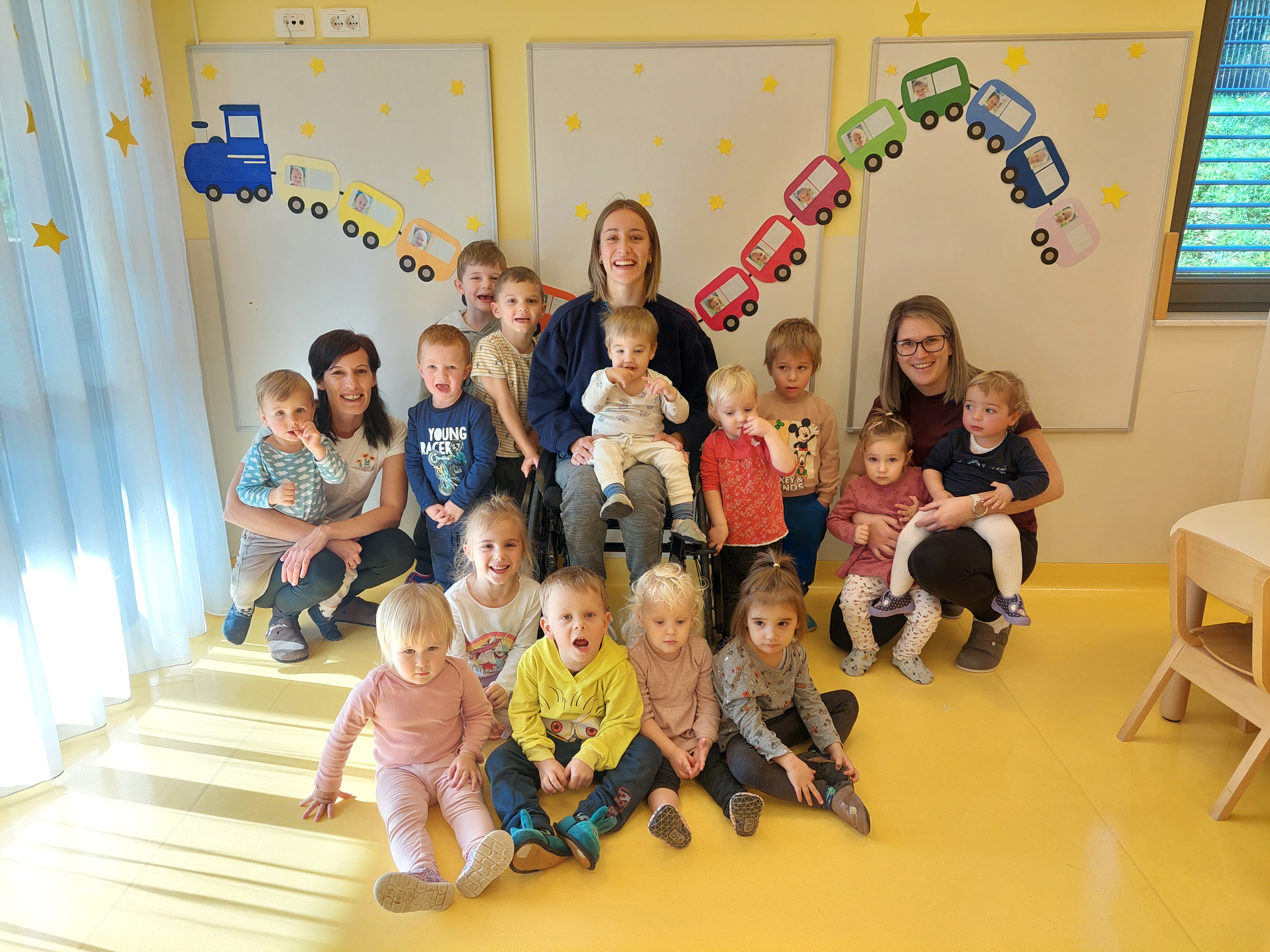 Danes smo v vrtcu gostili našo sovaščanko Tio Žagar, ki je prišla v družbi svoje mame Tine Fratine Žagar, njene največje opore, motivatorke in, kot v šali pravi Tia, kar lastne fizioterapevtke.