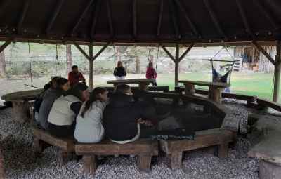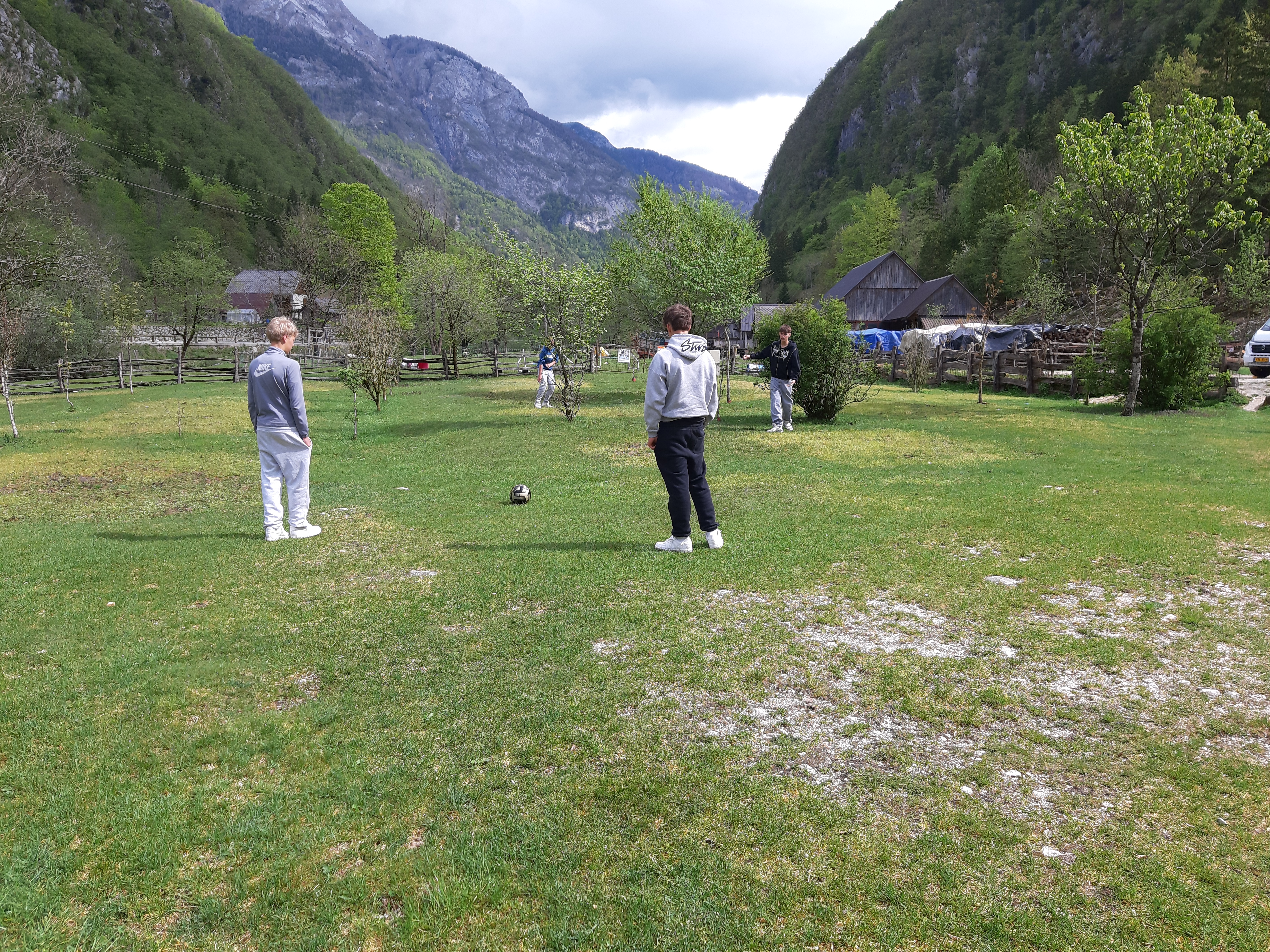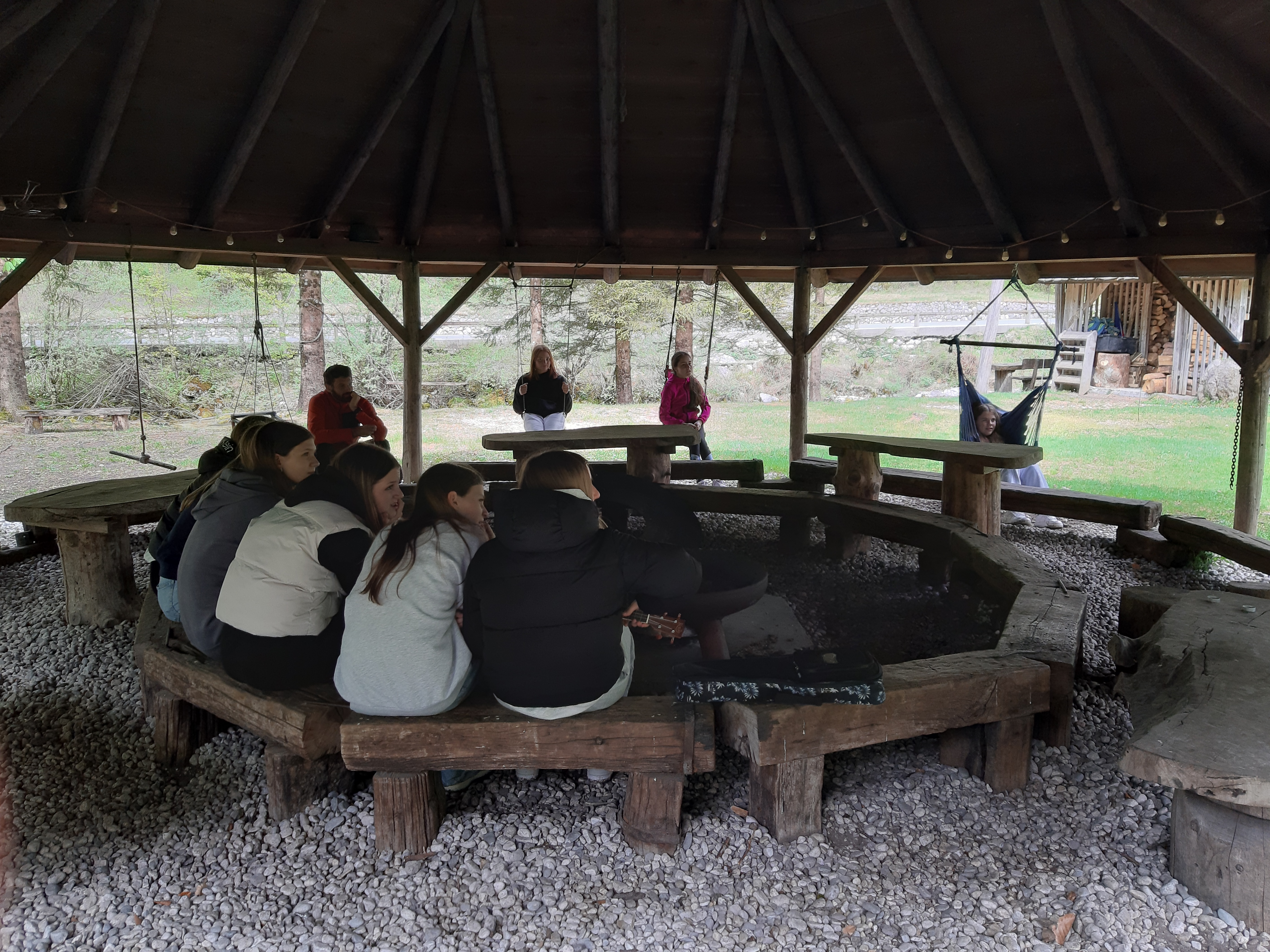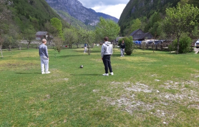 Ob koncu obiska smo se na lepo urejenem in ljudem prijaznem kampu sprostili ob igri z žogo, se pogovarjali in družili ob pokritem ognjišču ter prisluhnili reki Soči.