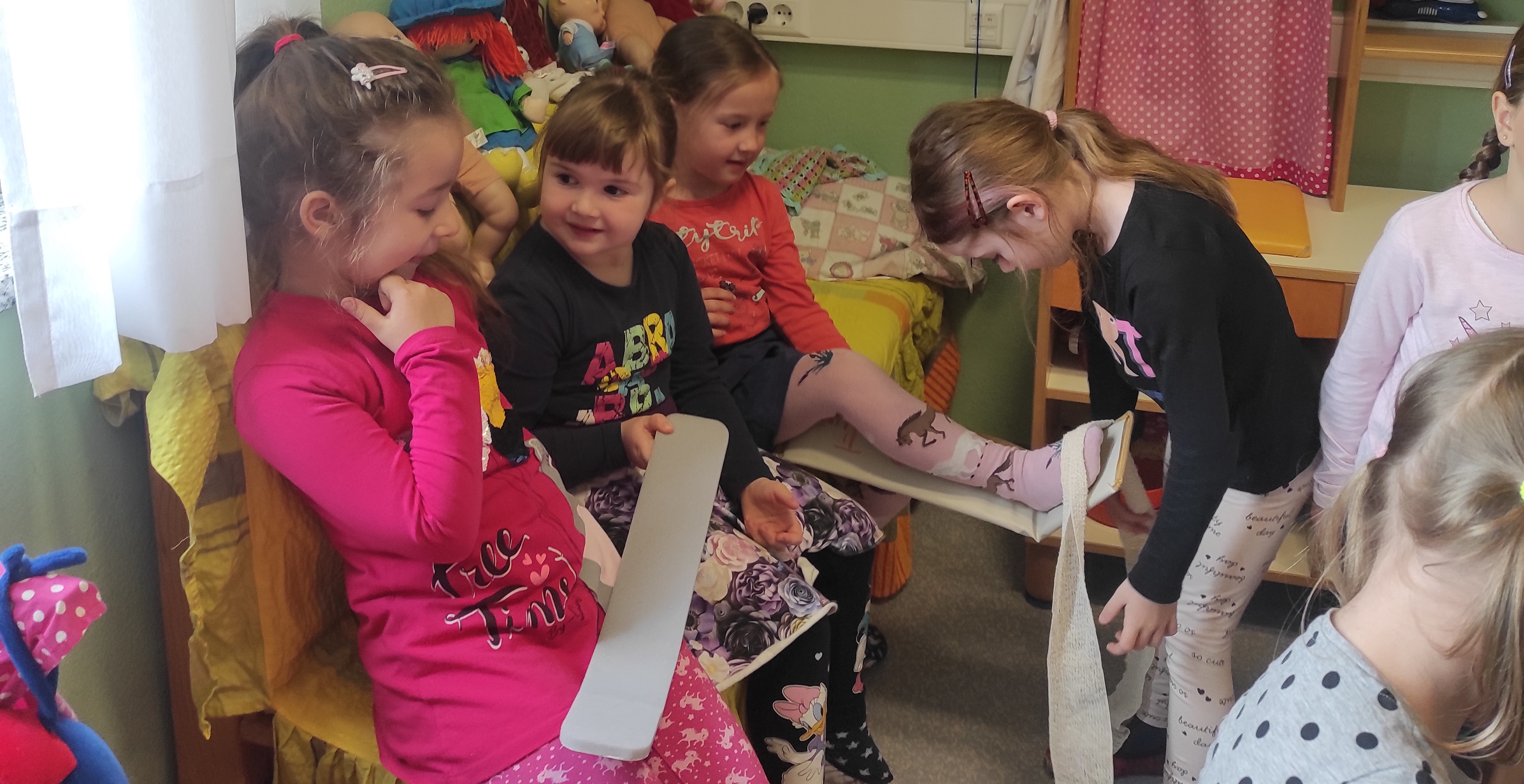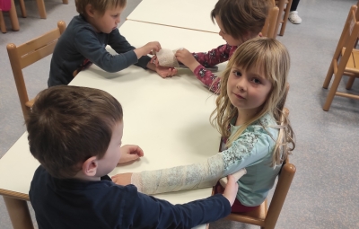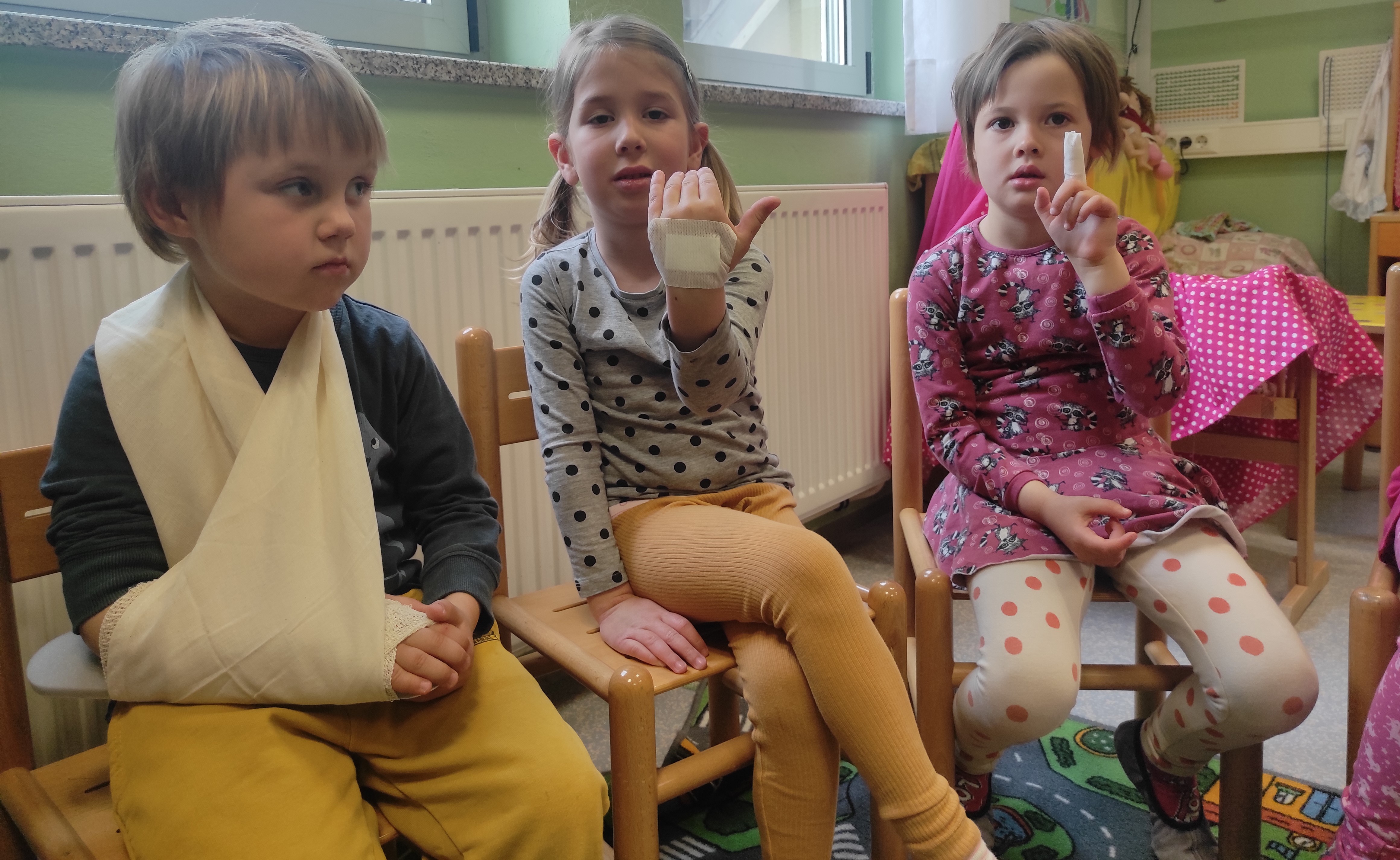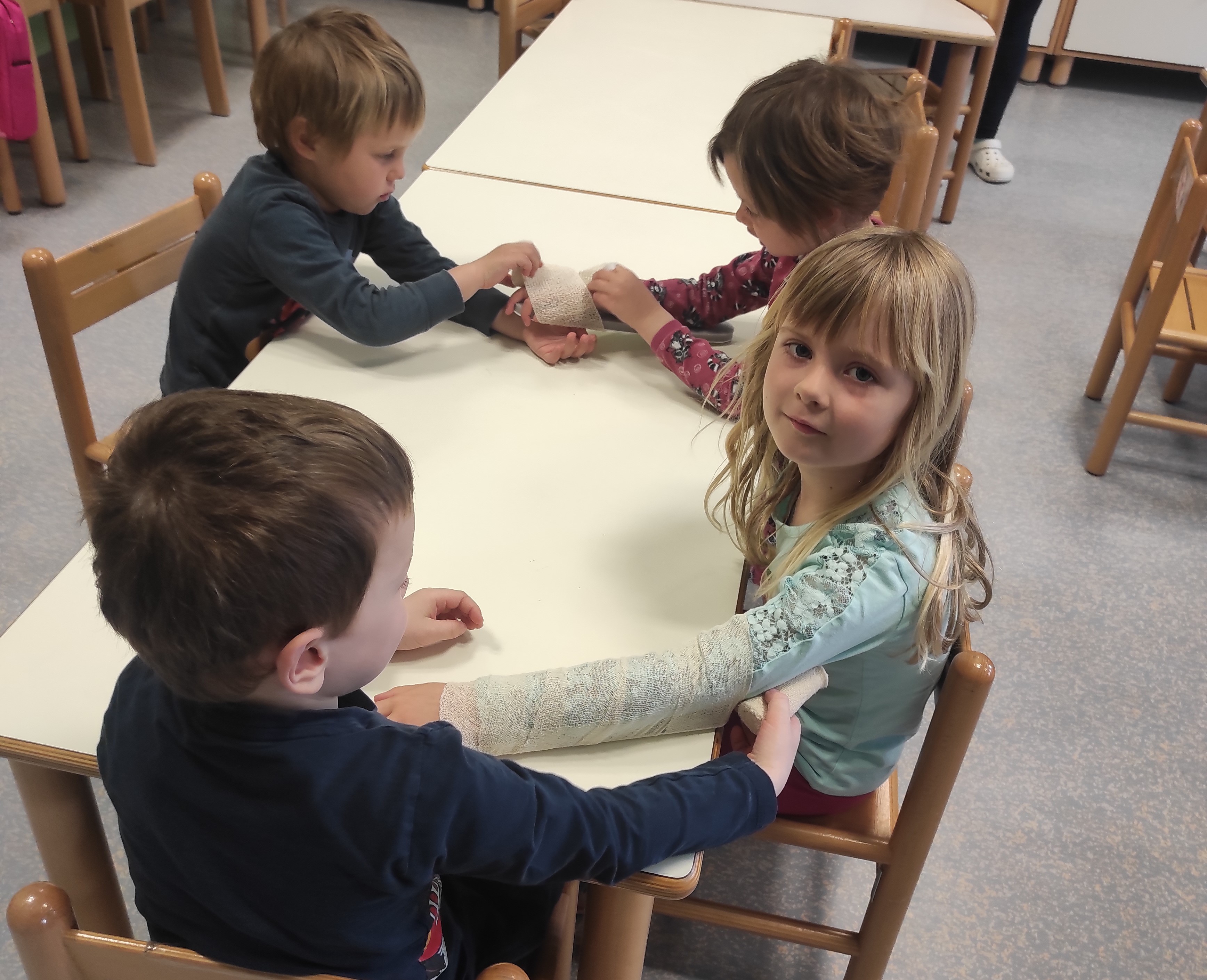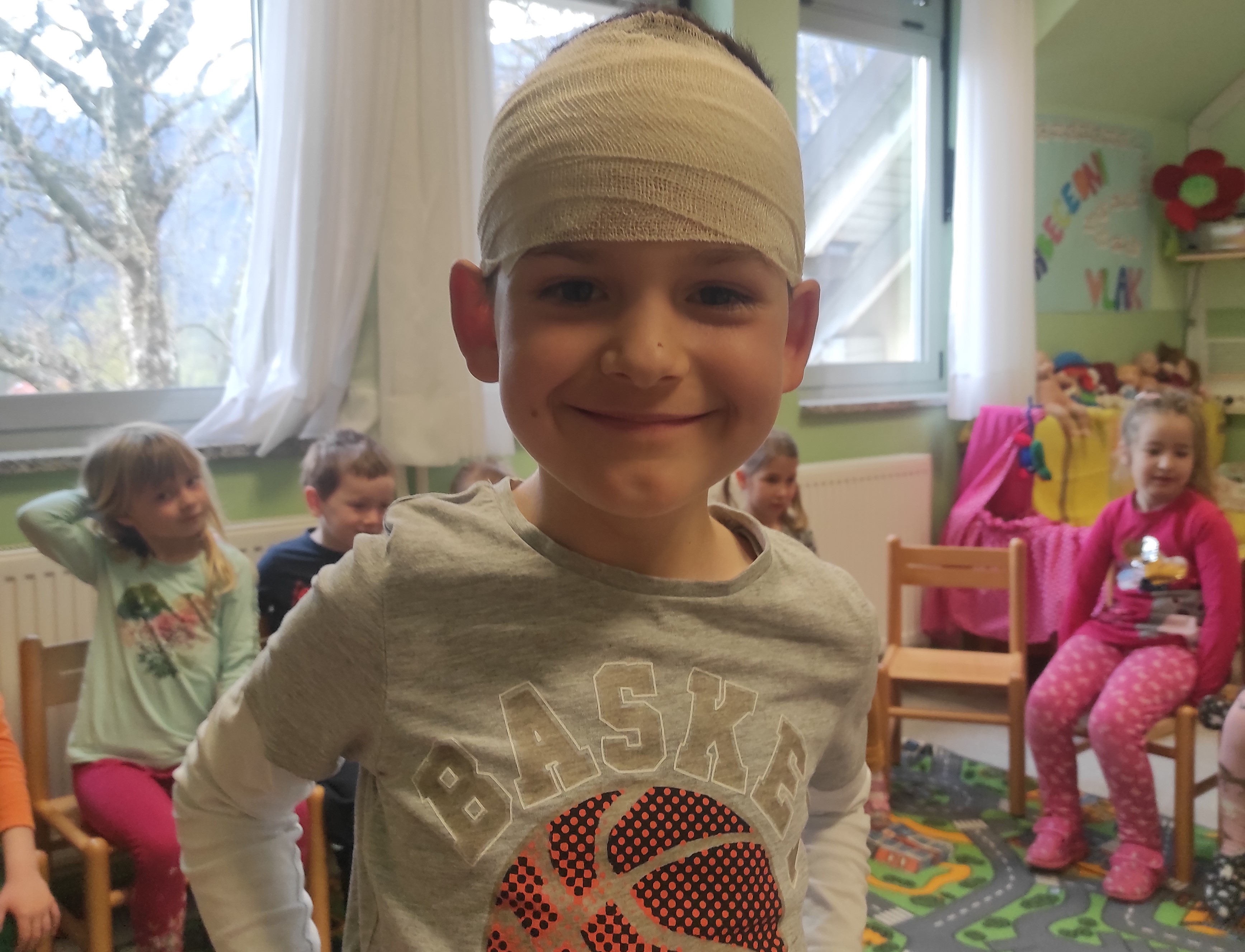 Tokrat nas je v skupini Škratkov obiskala medicinska sestra Špela Čujec ter nam predstavila osnove prve pomoči. Veliko smo že vedeli, naučili pa smo se tudi marsikaj novega. Gospa Špela je najprej pokazala, kako se oskrbi različne rane in poškodbe, nato pa smo se v prvi pomoči preizkusili tudi sami. Vsi otroci so se imeli možnost preizkusiti v obeh vlogah: v vlogi zdravnika - v povijanju in oskrbi ranjenca ter v vlogi poškodovanca.