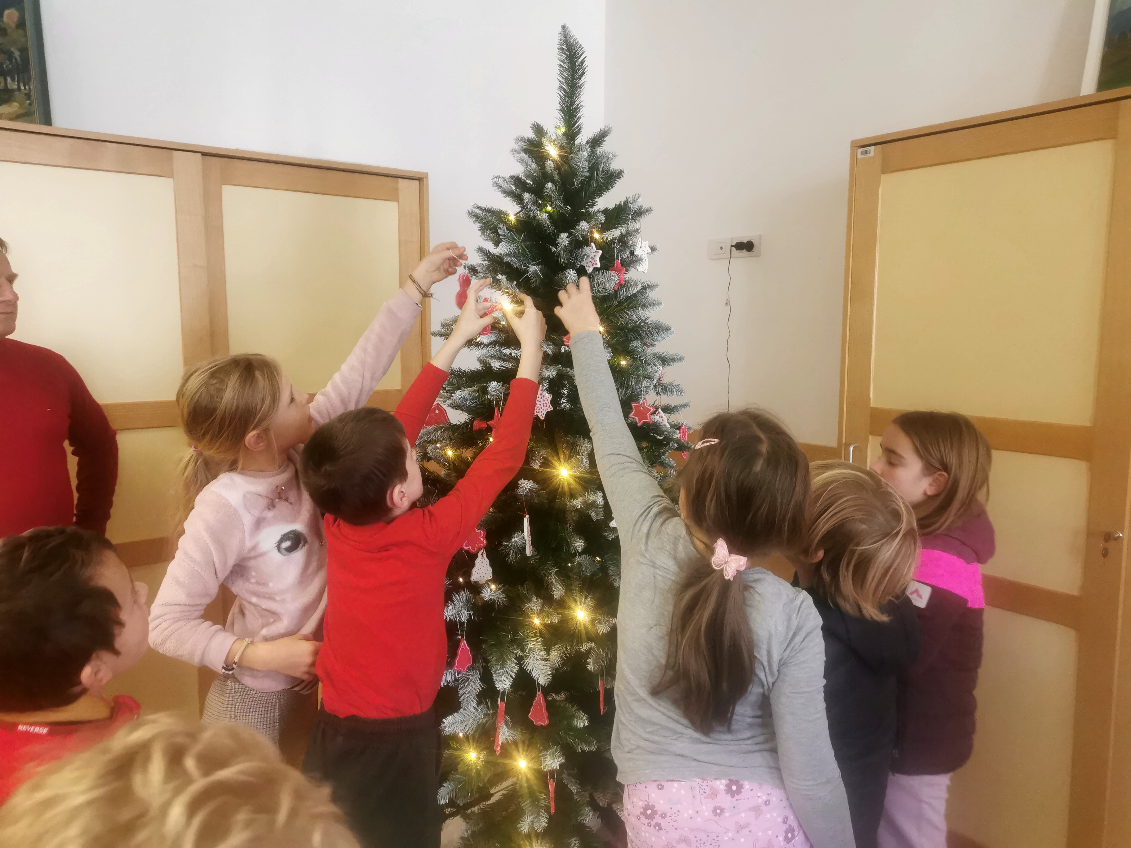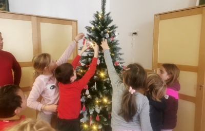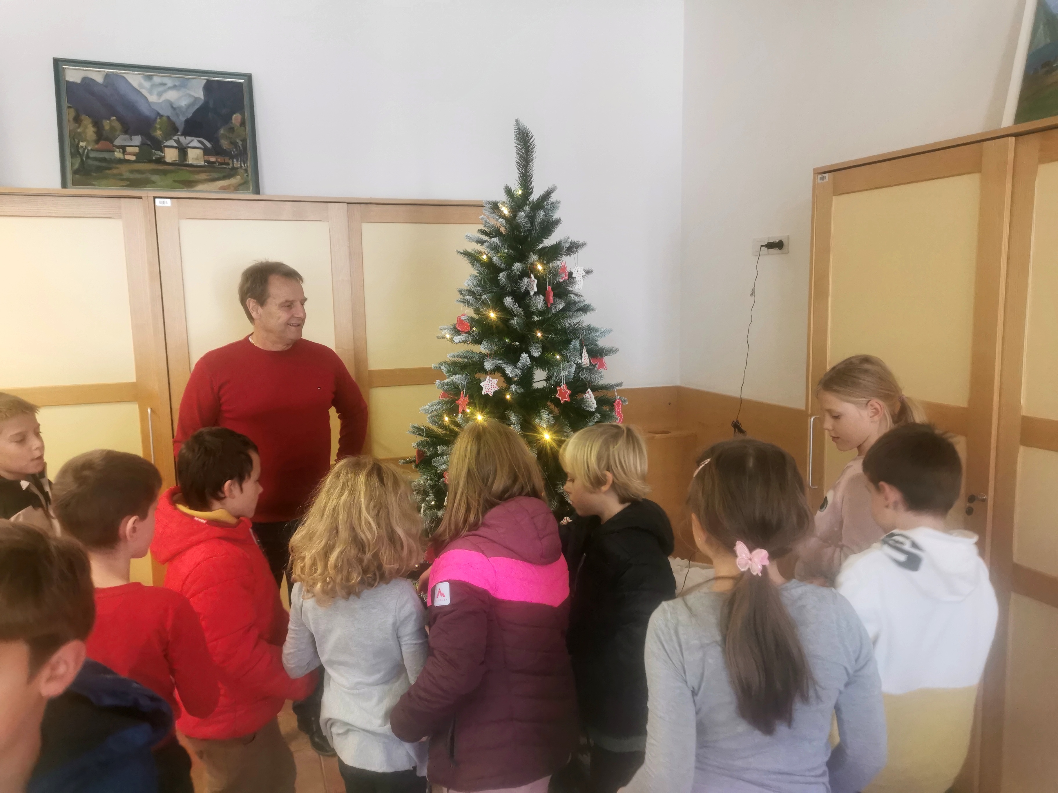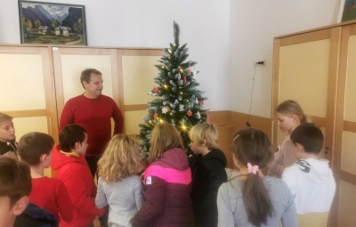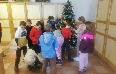 V petek, 13. 12. 2024 smo z učenci 3. razreda obiskali župana Občine Bovec. Namen našega obiska je bil poseben- prinesli smo okraske za novoetno jelko, ki bo krasila mestno hišo in vsem obiskovalcem prinesla praznično vzdušje. Župan in njegovi sodelavci so nas toplo sprejeli in pohvalili otroško ustvarjalnost in trud. Pogostili so nas s sokom, okusnimi piškoti in vročo čokolado.