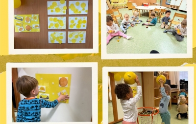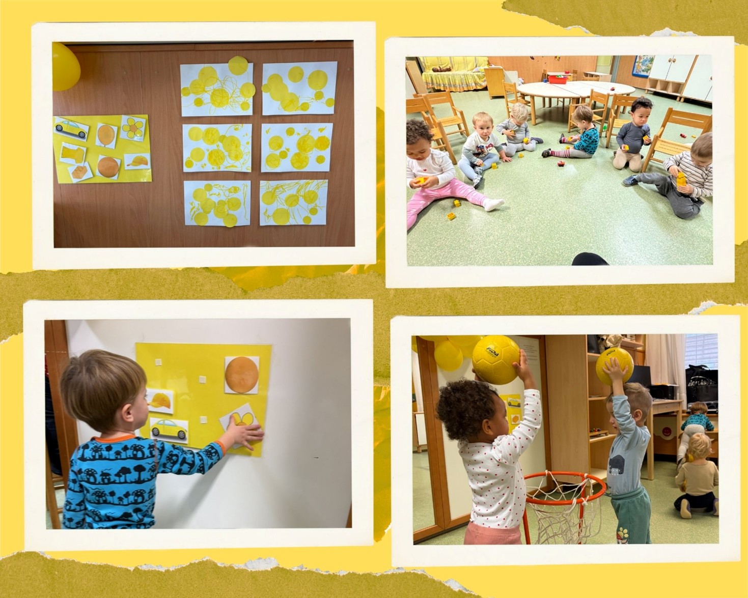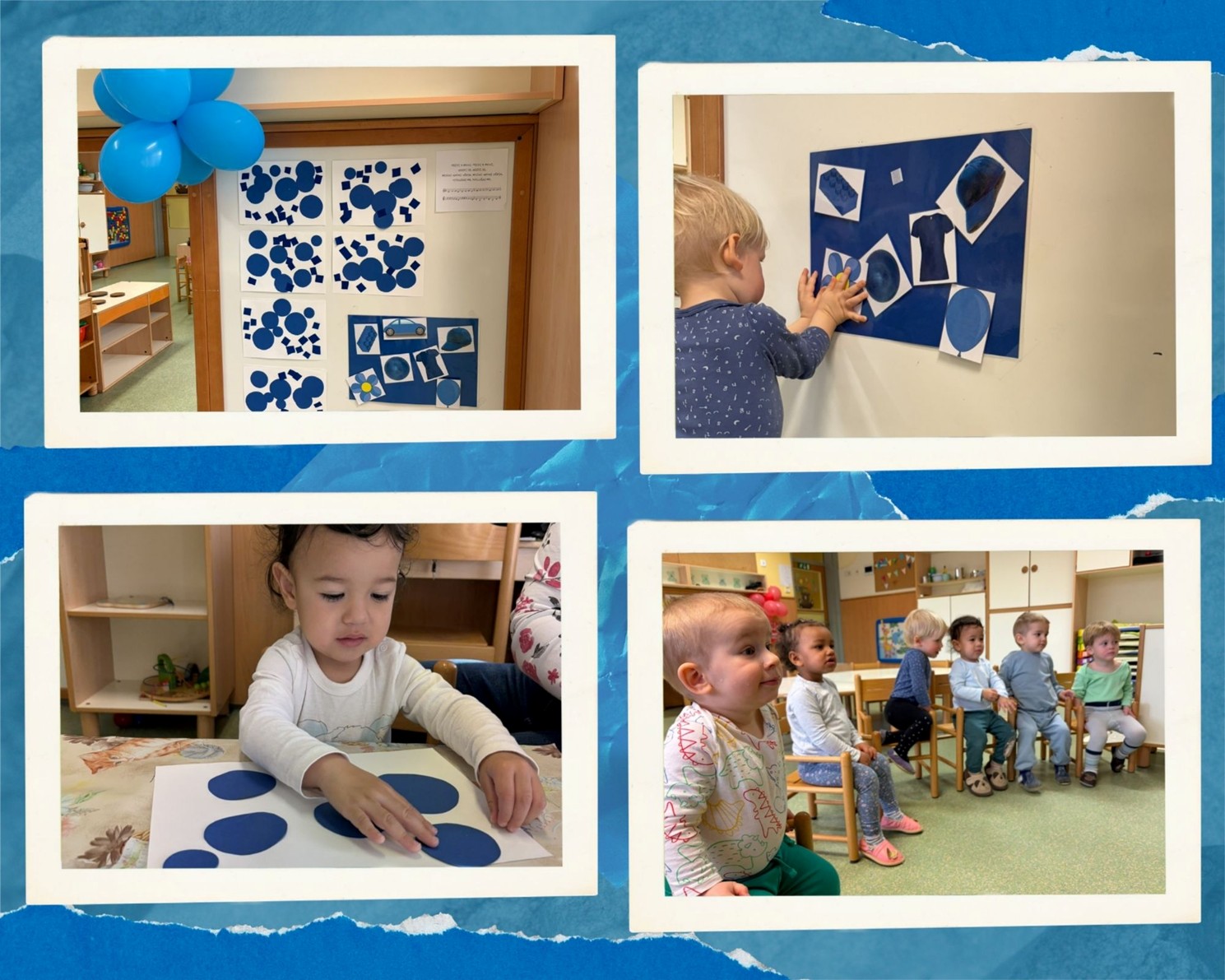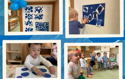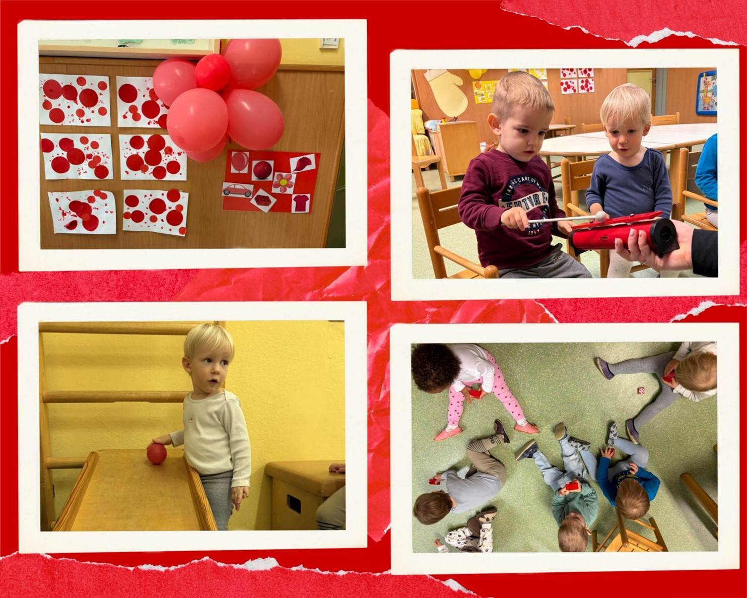 Pihali smo balone različnih barv in opazovali, kako se nežno dvignejo v zrak, razvrščali slike po barvah, iskali barve na sprehodu, sestavljali kocke ter se igrali z žogicami v rdeči, rumeni in modri barvi. Spretni prstki so lepili barvne kroge, risali s flomastri ter tiskali pikice.