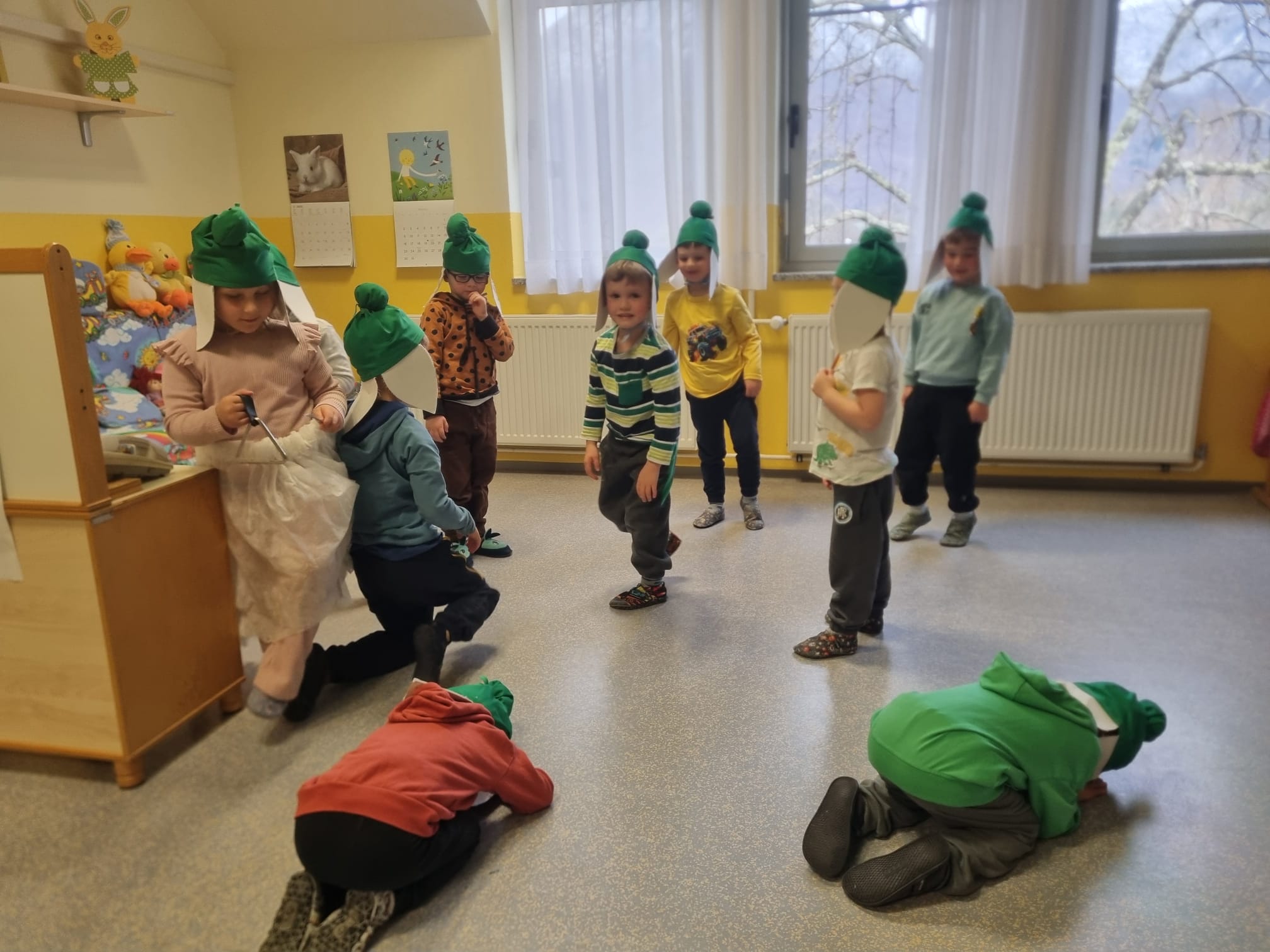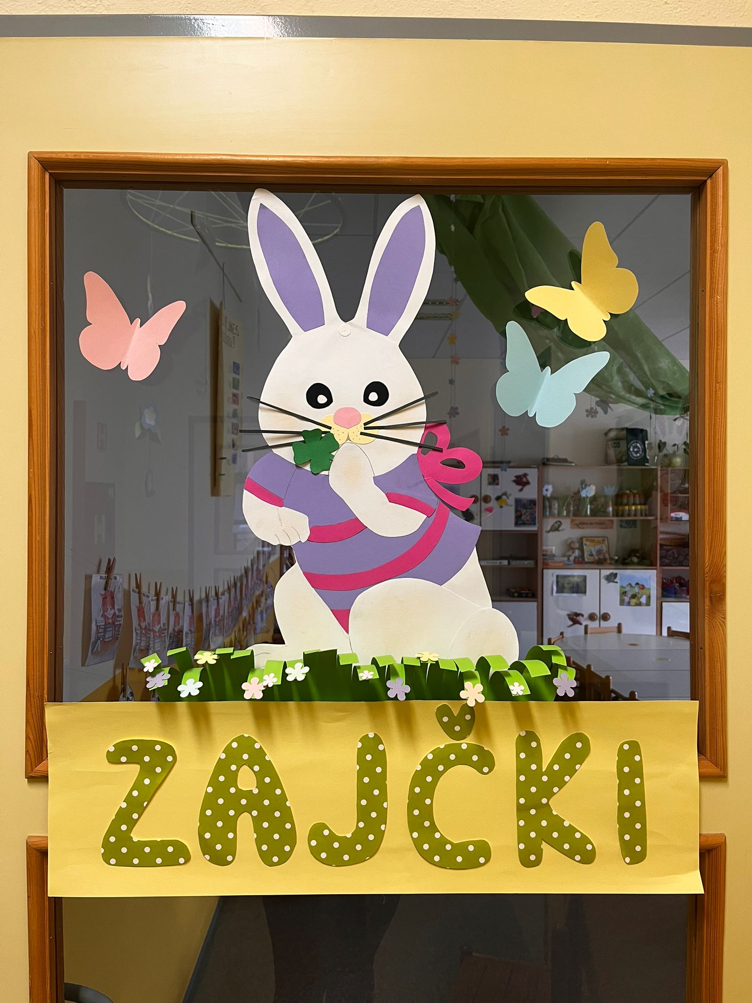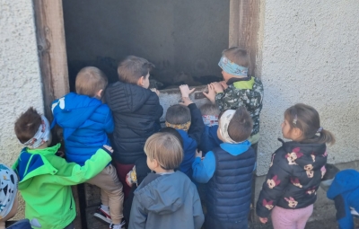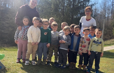 V skupini »Zajčki« smo igralnico spremenili v zelen travnik, odet v cvetlice, posut z metuljčki ter visečim zajčkom na gugalnici, hodnik ter panoje pa obogatili s spomladanskimi rožami, številnimi vrstami ptic ter barvitimi, pisanimi packami, slikami naših poizkusov ob mešanju različnih snovi ter barv. Skozi naša okna odmevajo številne lepe, pomladne melodije, tako od našega ubranega petja, kot od plesa, saj smo zaplesali pravi pomladni ples, s prebujanjem vseh pomladnih rožic. Poskočni koraki pa so nas na topel dan odnesli do Ostanove kmetije v Šijo, da bi presenetili našega "Zajčka" iz skupine. Tu nam je oče našega Danijela Rubna, David Ostan, prijazno pokazal svojo kmetijo. Popeljal nas je od hleva do hleva, nam razkazal vse živali, nam omogočil pristen stik s kokošmi, petelinom, pujsi, ovcami in številnimi jagnjeti, katere smo tudi pestovali ter božali. Kmet David nam je povedal nekaj o kmetovanju in o ovcah, Danijel Ruben pa nas je prijazno povabil v svoj mali raj ter nesebično vsem otrokom posodil svoji gugalnici. Ob razigrani igri na travniku, sadni malici ter zvonjenju pri cerkvici ob lepih željah, smo se ob poslušanju ptičjega petja, brenčanju čebel skozi gozd in čez travnik odpravili nazaj proti vrtcu. Hvala G. Davidu Ostanu za prijazen in prijeten sprejem na kmetiji, kot že vsa ta leta, ko skupaj sodelujemo.