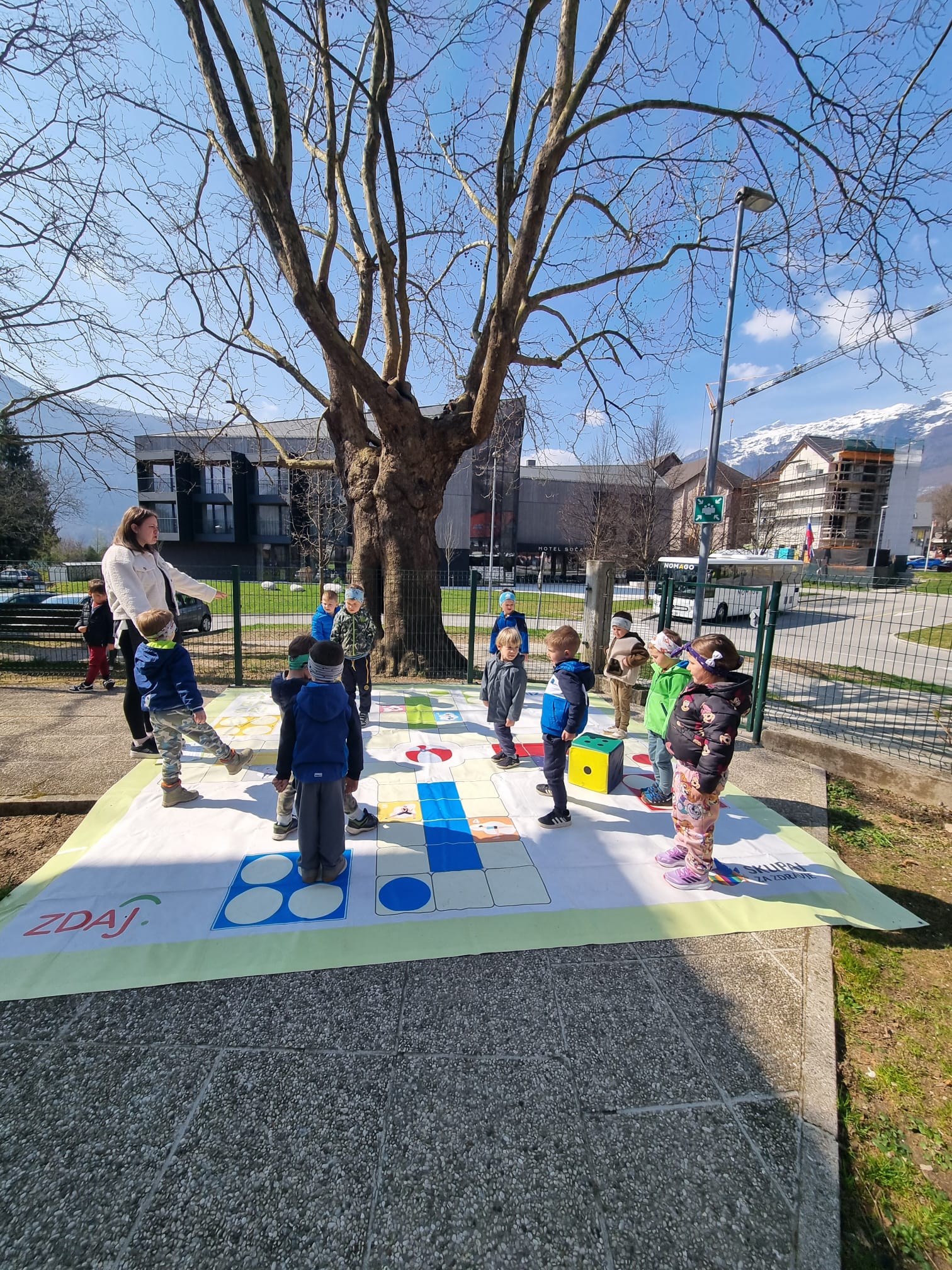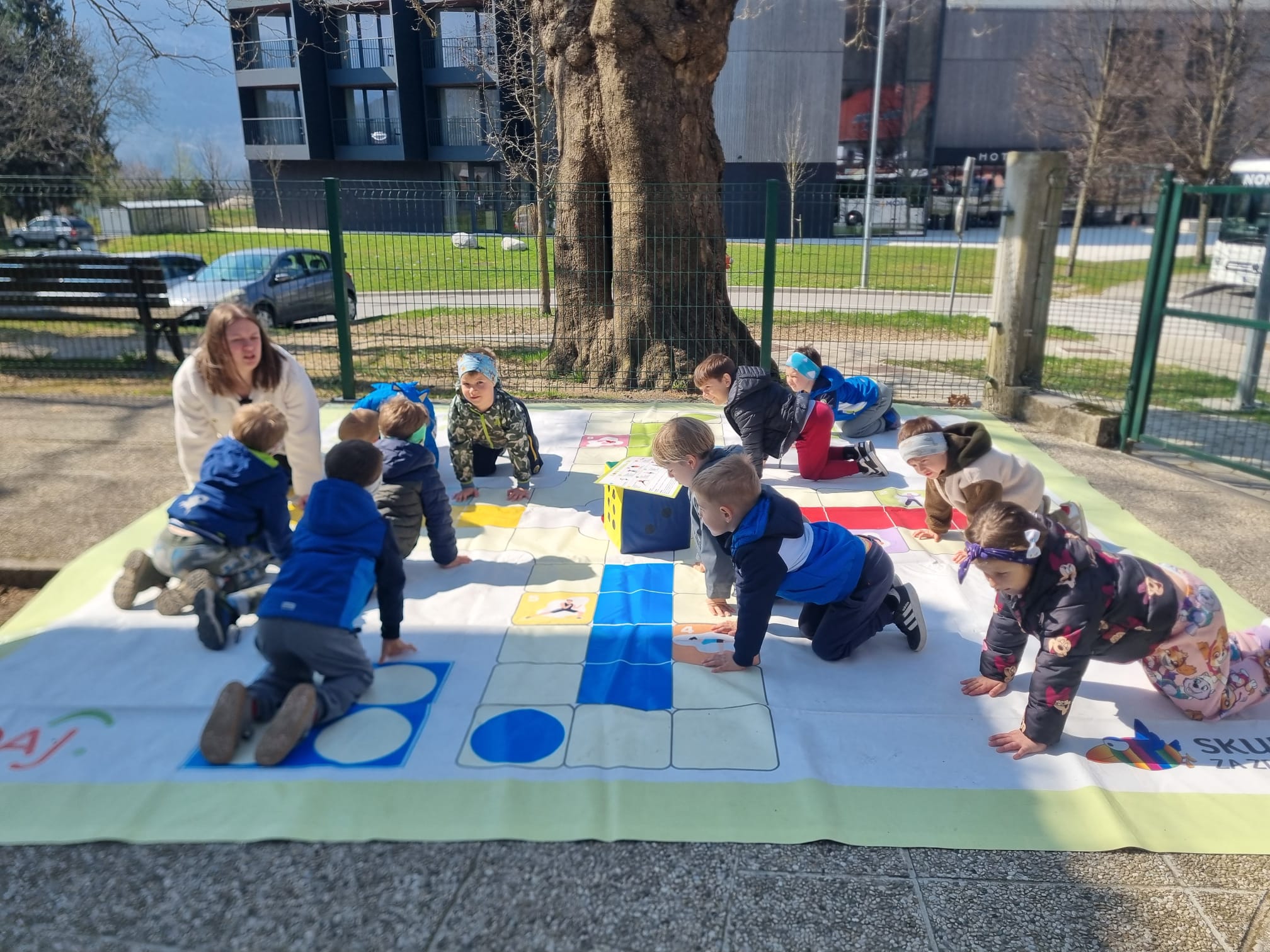 Lepo vreme smo izkoristili tudi za preizkus talne igre »Človek, razgibaj se«, ki so nam jo poslali v preizkus iz NJIZ-ja, saj smo včlanjeni v projekt Zdravje v vrtcu. Igrali smo se jo pred vrtcem, na asfaltni površini in se dobro natelovadili.