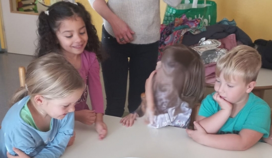 V ponedeljek, 14. 10. 2024, so nas v vrtcu obiskale bovške upokojenke, ki redno, večkrat na teden zjutraj skupaj telovadijo.