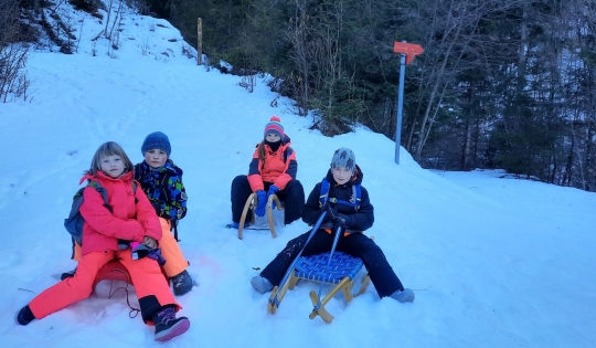 Učenci Podružnične šole Soča smo se preizkusili na sankaški progi iz Gmajne v Trenti.