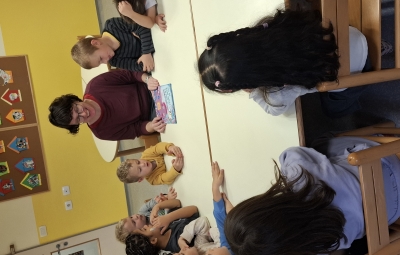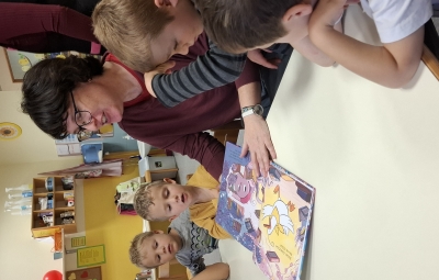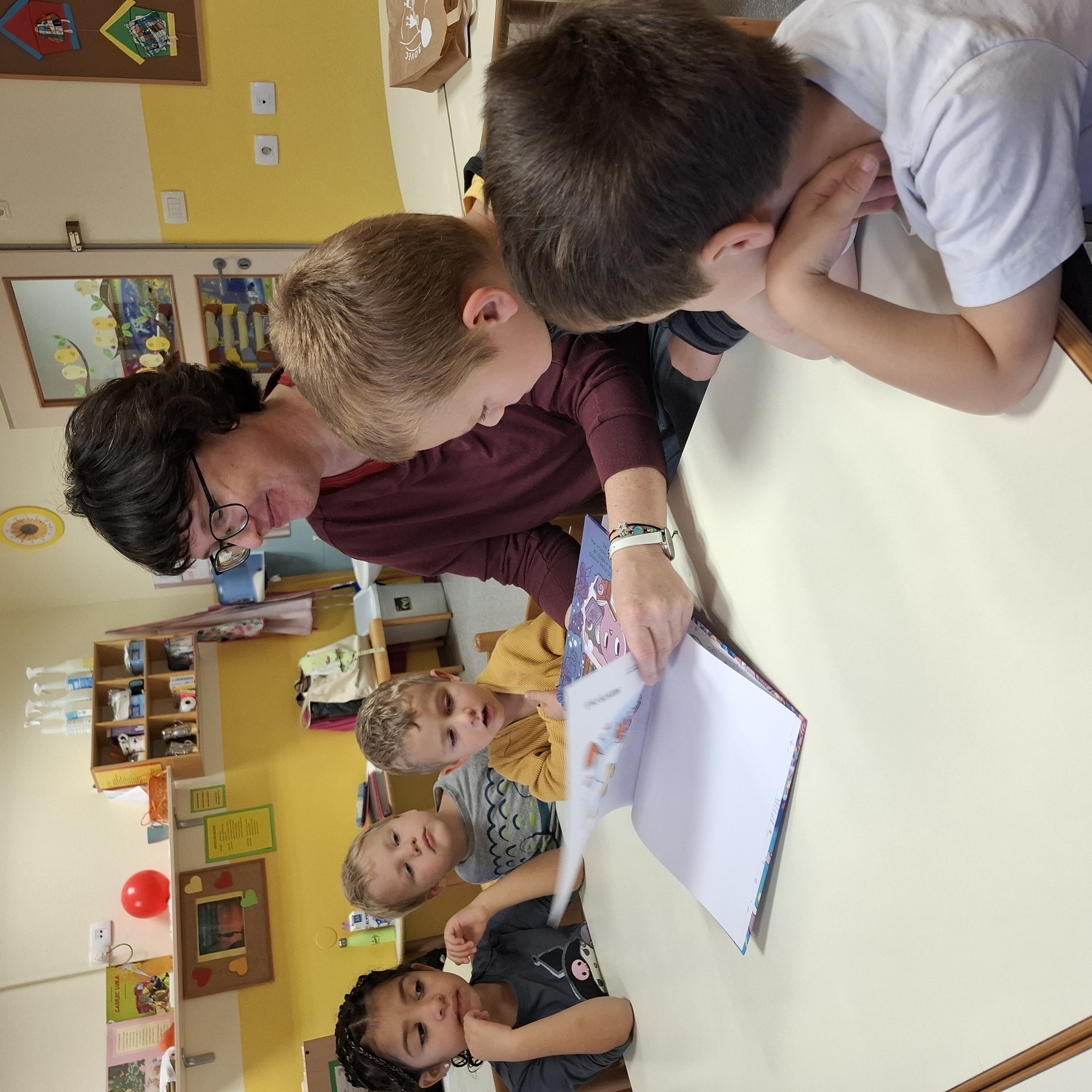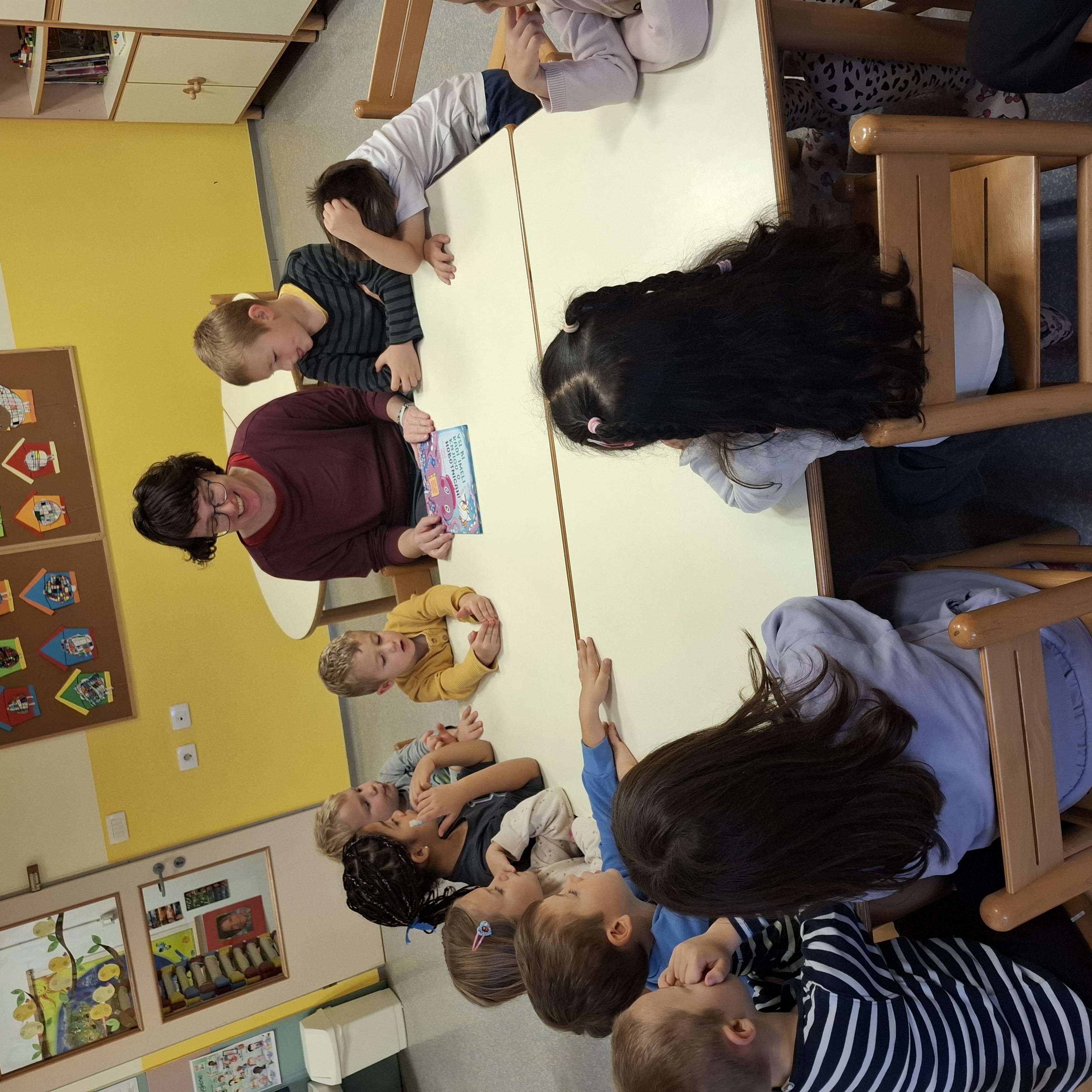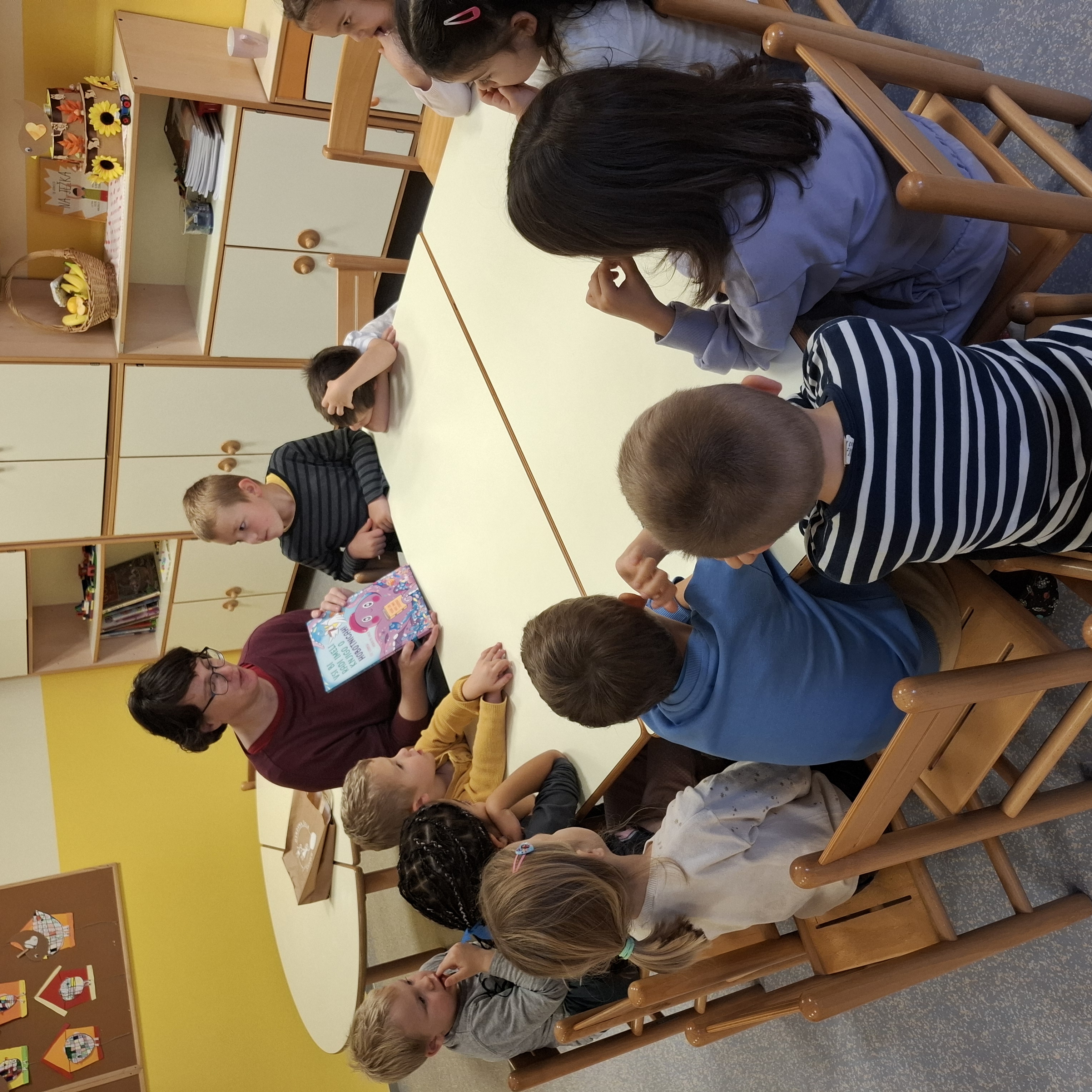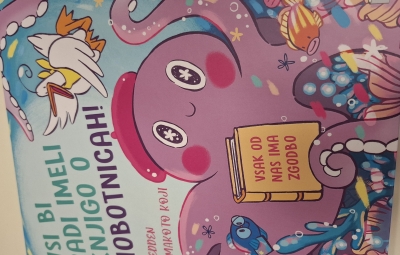Včeraj, v sredo nas je obiskala šolska knjižničarka Urška. Pogovarjali smo se o knjigah, kako ravnamo s knjigami, kaj počnemo v knjižnici, katere knjižnice obiskujemo. Spoznali smo, kako je knjiga napisana in kdo piše pravljice in kdo pesmice. Prebrala nam je lepo pravljico o hobotnici, ki je spoznala prijateljico račko. Skozi pravljico smo lahko ugotovili, kako pomembno je, da imamo prijatelje. Pravljico smo z zanimanjem poslušali in občudovali prelepe ilustracije. Knjižničarka nam je prinesla tudi pobarvanke z različnimi hobotnica, velikimi, majhnimi, veselimi in prijaznimi. Pobarvali smo vsak svojo hobotnico.