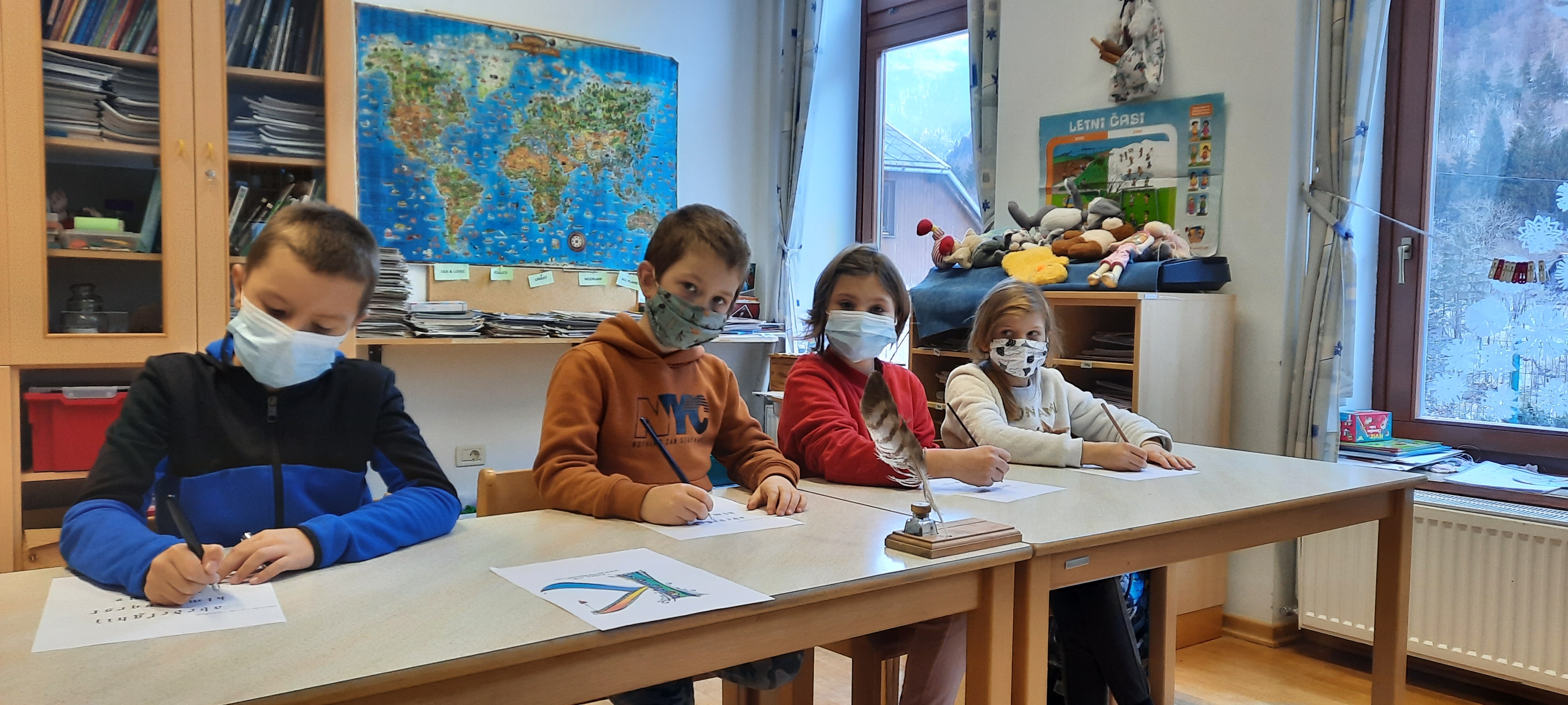Na Podružnični šoli Soča so se pogovarjali o razvoju pisav v zgodovini. Spoznali so kaligrafijo in se preizkusili v pisanju s kaligrafskimi peresi.