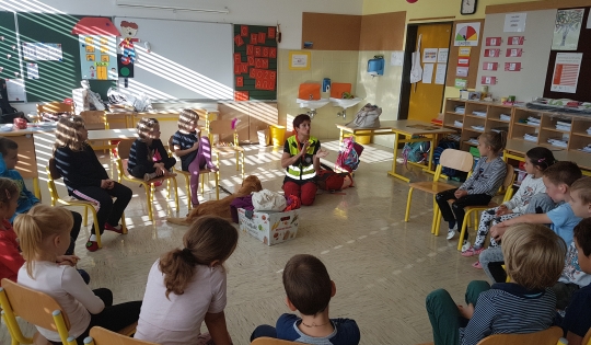 V 1. in 2. razredu nas je obiskala Nikina mama s psičko Ajko. Predstavila nam je delo gorskih reševalcev, pokazala opremo in nas seznanila kaj potrebujemo za obisk gora.